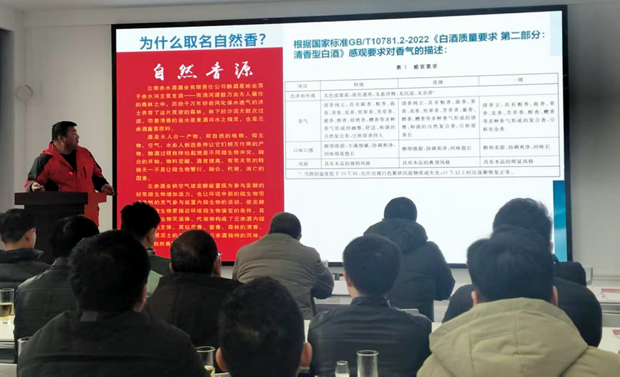 ▲昆明酒类行业协会会长方志强致辞 在众人的期待中,云赤酒业副总经理鲁松正式发布了“云赤自然香”新品。这款产品是云赤酒业坚守匠心与科技创新的集中体现。公司始终铭记“护好青山绿水,酿造本草庄园,服务民族健康,促进经济发展”的企业使命,在传承古法酿造技艺之时,不断加大酒体研发与品质管控投入。通过依托现代科技,实现了本草精华的有效萃取,使得“云赤自然香”不仅具有优异的口感,更蕴含着丰富的健康内涵。 展望未来,云赤酒业绘就了一幅清晰的发展蓝图。公司表示将以品质为基,精研酿造工艺,持续提升产品品质与口感。为了满足市场对健康饮酒的消费需求,云赤酒业计划推出多种优质白酒与养生产品,让消费者在享受美酒的同时,也能收获健康。