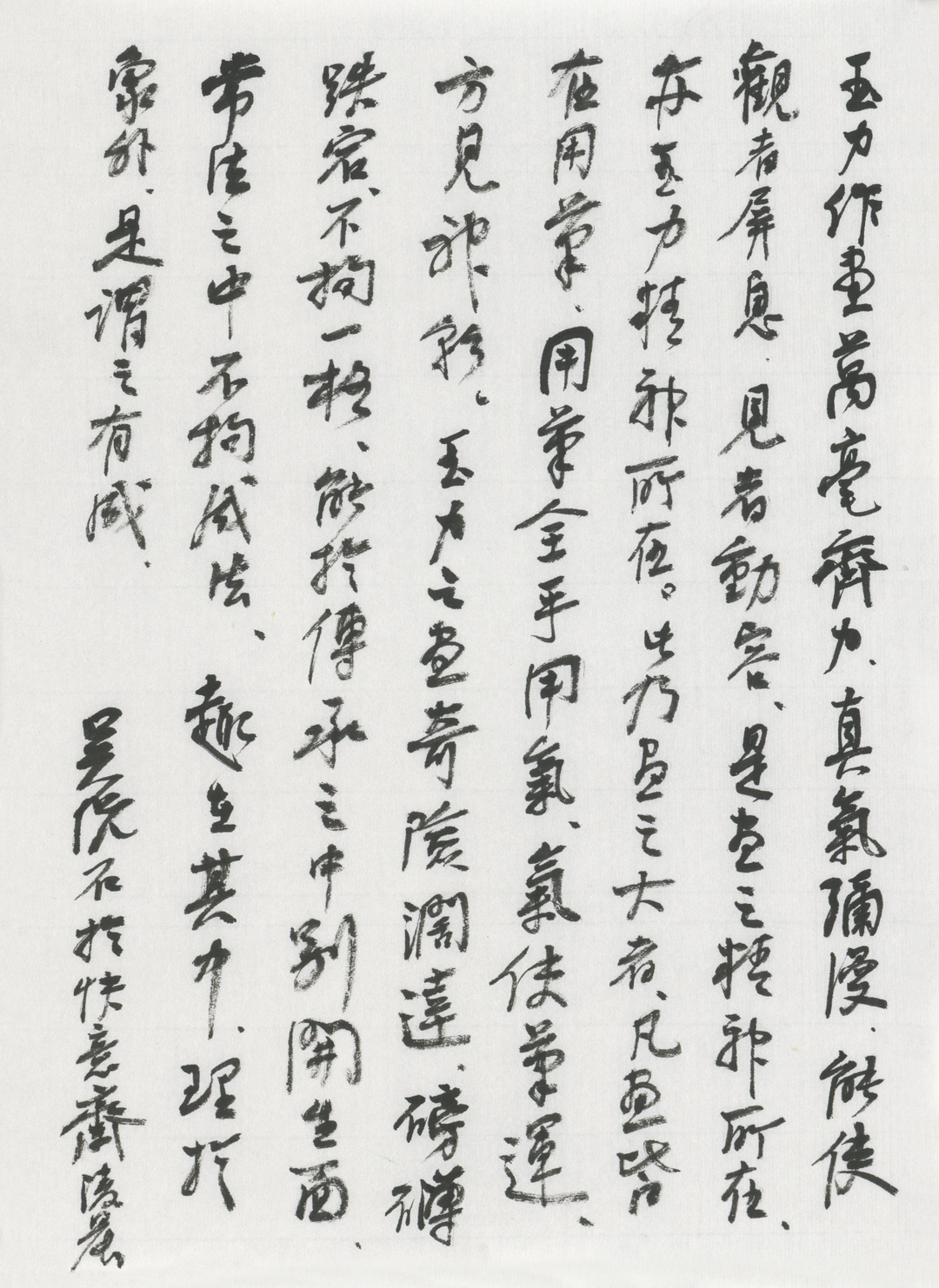 释文: 玉力作画万毫齐力,真气弥漫,能使观者屏息,见者动容,是画之精神所在,亦是玉力精神所在。此乃画之大者,凡画皆在用笔,用笔全乎用气,气使笔运,方见神采。玉力之画奇险阔达,磅礴跌宕,不拘一格,能于传承之中别开生面,常法之中不拘成法,趣在其中,理于象外,是谓之有成。 ——吴悦石于快意斋凌晨