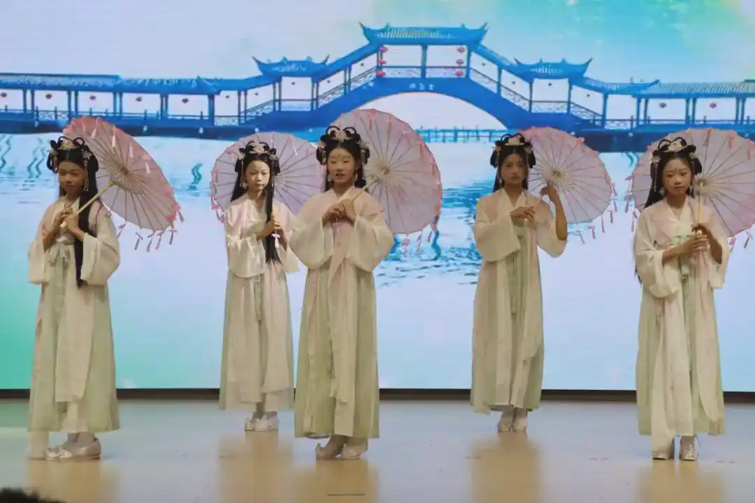 朗诵《青春》以铿锵之声诉说成长誓言,而汉服社团的《笔墨裁春 礼仪华裳》更以衣袂翩跹演绎中华礼仪之美。从爵士舞《YES!OK!》的活力四射到小品《你有我也有》的诙谐幽默,七年级学子用多元形式展现综合素质的全面提升。他们的表演或许稚嫩,却饱含真诚,每一帧画面都是成长路上最鲜活的注脚。 八年级的节目则更显深度与厚度,彰显学子日渐成熟的艺术表达力。朗诵《唐诗里的中国》以恢弘气势穿越千年文脉,古典舞《簪花引》《落了白》以柔美身姿演绎东方韵致。古筝合奏《象王行》磅礴大气,歌曲《我爱你中国》唱出赤子深情。