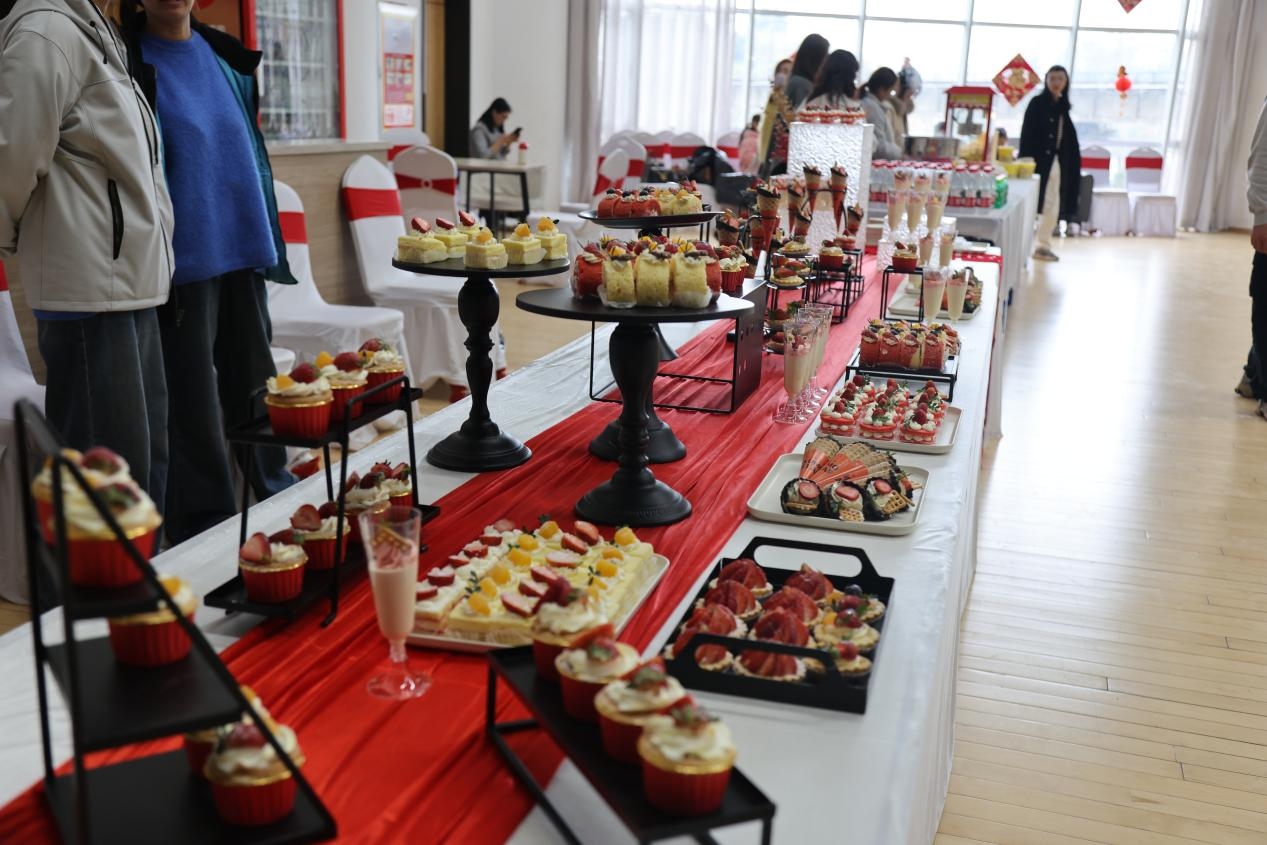 位于篮球场入口左侧的美食区香气四溢,现煮汤圆、爆米花、棉花糖、烤肠等传统美食供应不断。一旁的冷餐甜品台更是琳琅满目:鲜花杯子蛋糕、橙味慕斯杯、瑞士卷、黄桃果塔等十余种精致甜点,让大家大饱口福。