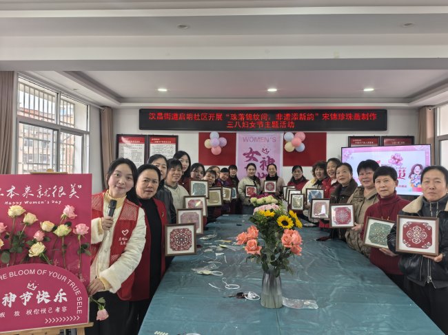 ——平江县汉昌街道启明社区开展“三八”妇女节宋锦珍珠画主题活动 春风有信,花开有期。在这万物复苏、春花烂漫的美好时节,我们即将迎来第116个“三八”国际妇女节。为传承非遗文化,丰富社区女性精神文化生活,进一步关爱女性身心健康,展现新时代女性自信、优雅、独立的风采,2026年3月5日上午,平江县汉昌街道启明社区、启明社区妇女联合会联合开展了“珠落锦纹间 非遗添新韵”宋锦珍珠画三八妇女节主题活动。以指尖艺术诠释艺术美学,让女神们放下手中的忙碌,一起享受节日的快乐。