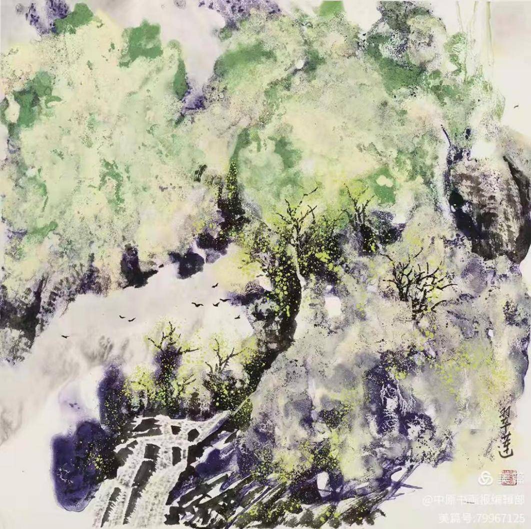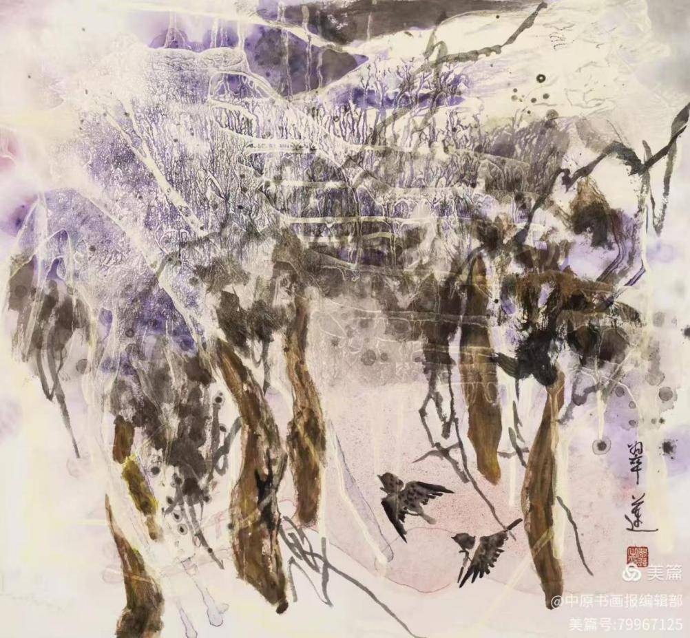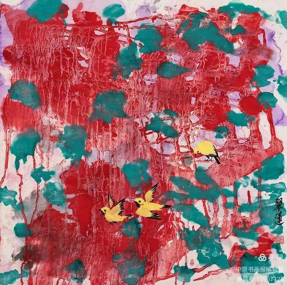 觅诗图68×68cm 1.技法融合:以国画为载体,将中国书法笔势(如侧、勒、努、趯)融入抽象表现,形成“色彩交响”与“墨韵节奏”的独特视觉语言;2.哲学表达:作品突破物象束缚,通过《迭代共晖》等巨作传递“天人合一”的东方宇宙观;3.材料实验:牛皮纸尝试水墨与泼彩,如她的《旋律》浓缩肌理韵律,展现返璞归真的艺术境界。 乔翠莲以“无分界”理念打破东西方艺术壁垒,其创作既是新世纪新意象绘画的见证,也是中国传统艺术向现代化转型的典范。