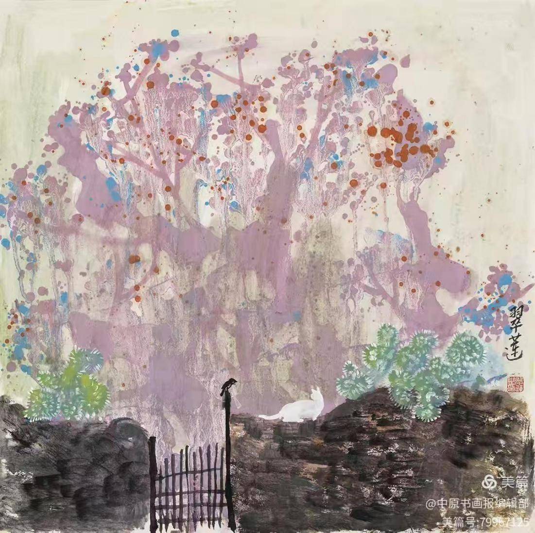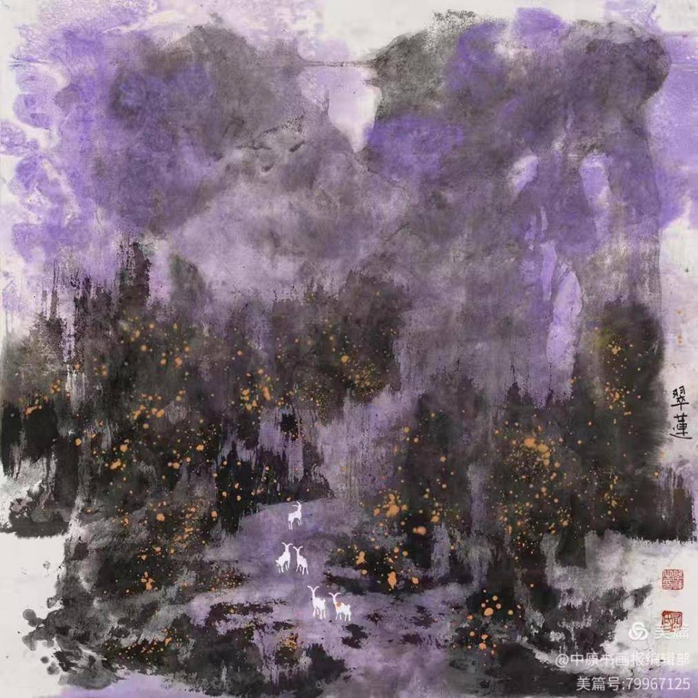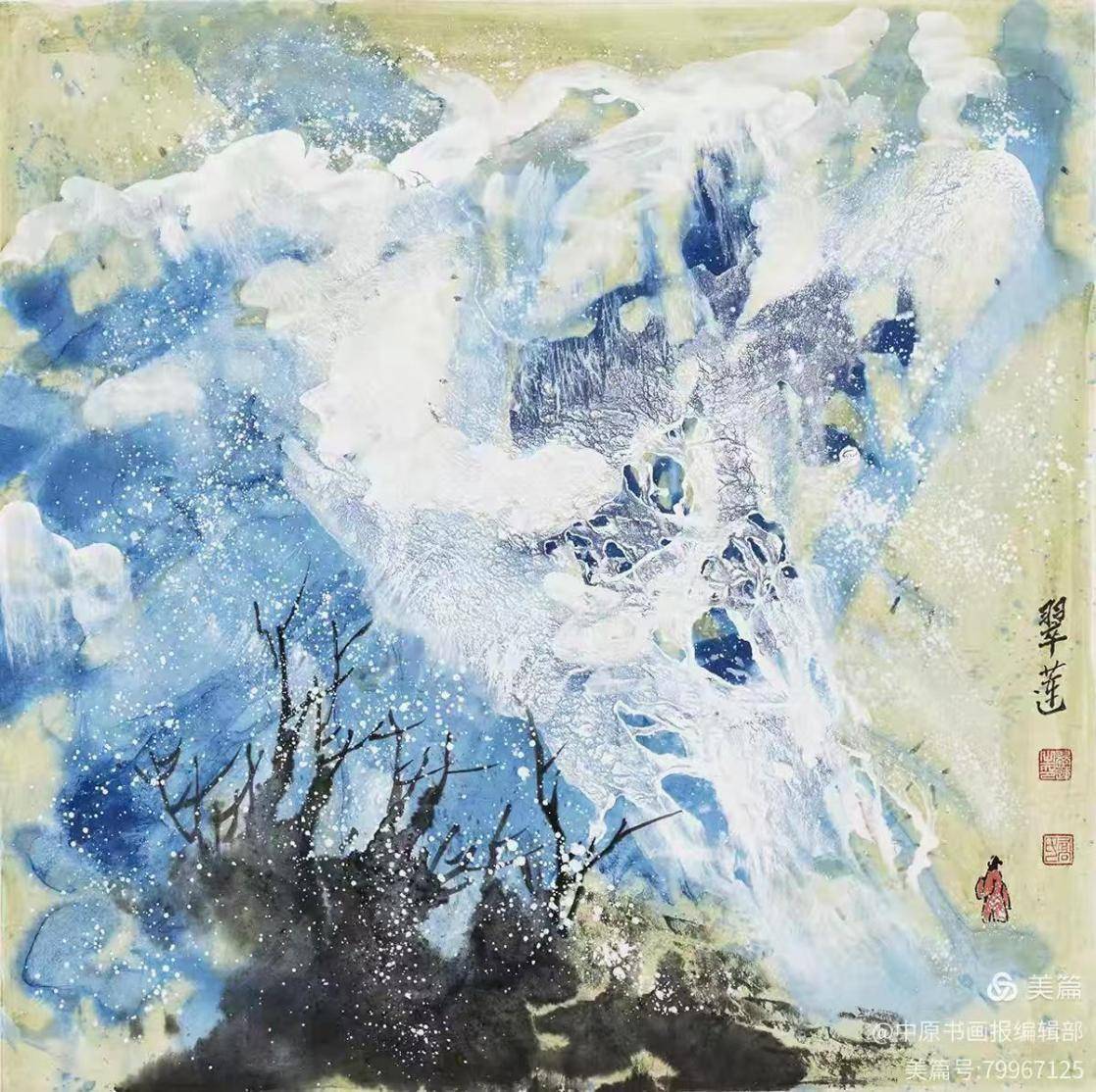 觅诗图68×68cm 1.技法融合:以国画为载体,将中国书法笔势(如侧、勒、努、趯)融入抽象表现,形成“色彩交响”与“墨韵节奏”的独特视觉语言;2.哲学表达:作品突破物象束缚,通过《迭代共晖》等巨作传递“天人合一”的东方宇宙观;3.材料实验:牛皮纸尝试水墨与泼彩,如她的《旋律》浓缩肌理韵律,展现返璞归真的艺术境界。 乔翠莲以“无分界”理念打破东西方艺术壁垒,其创作既是新世纪新意象绘画的见证,也是中国传统艺术向现代化转型的典范。