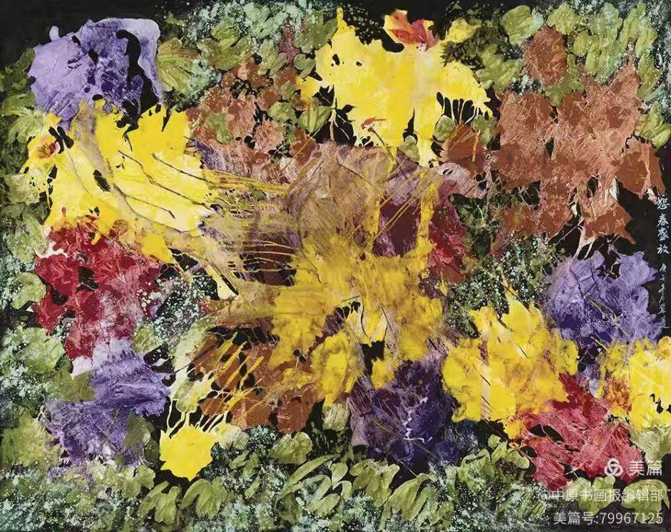 花海情缘275cm×214cm 《花海情愫》系列及《怒春盛放》系列,是乔翠莲按照中国新意象艺术的价值标准量身打造的精品力作。首先是原创性,其图式、风格、符号具有鲜明与众不同的个性,让人过目不忘;其次是审美性,色彩、构成、线条、细节、肌理,都必须以专业的眼光反复推敲,不放过任何一处瑕疵,让偶发性和神来之笔恰到好处;其三是技术性,追求技术表现的丰富性和复杂性,不吝啬在一幅画上花费时间,因为时间也是一种难度,她甚至发明绝技,来保证作品的唯一性;其四是本土化与民族化,以此作为艺术的宗旨,让东方性成为首要的视觉冲击力;其五是人文精神,视觉艺术体现的东方人文精神,坚韧、醇厚、内敛、气韵、高古、大气。她采用随机拼贴,精心构成,让视觉效果充满了东方魅力和当代意识,保留着东方艺术所特有的典雅与尊贵。作品的图式风格、符号构成与情绪视觉,都满足了审美者精神基因中的本土意识和东方情怀。