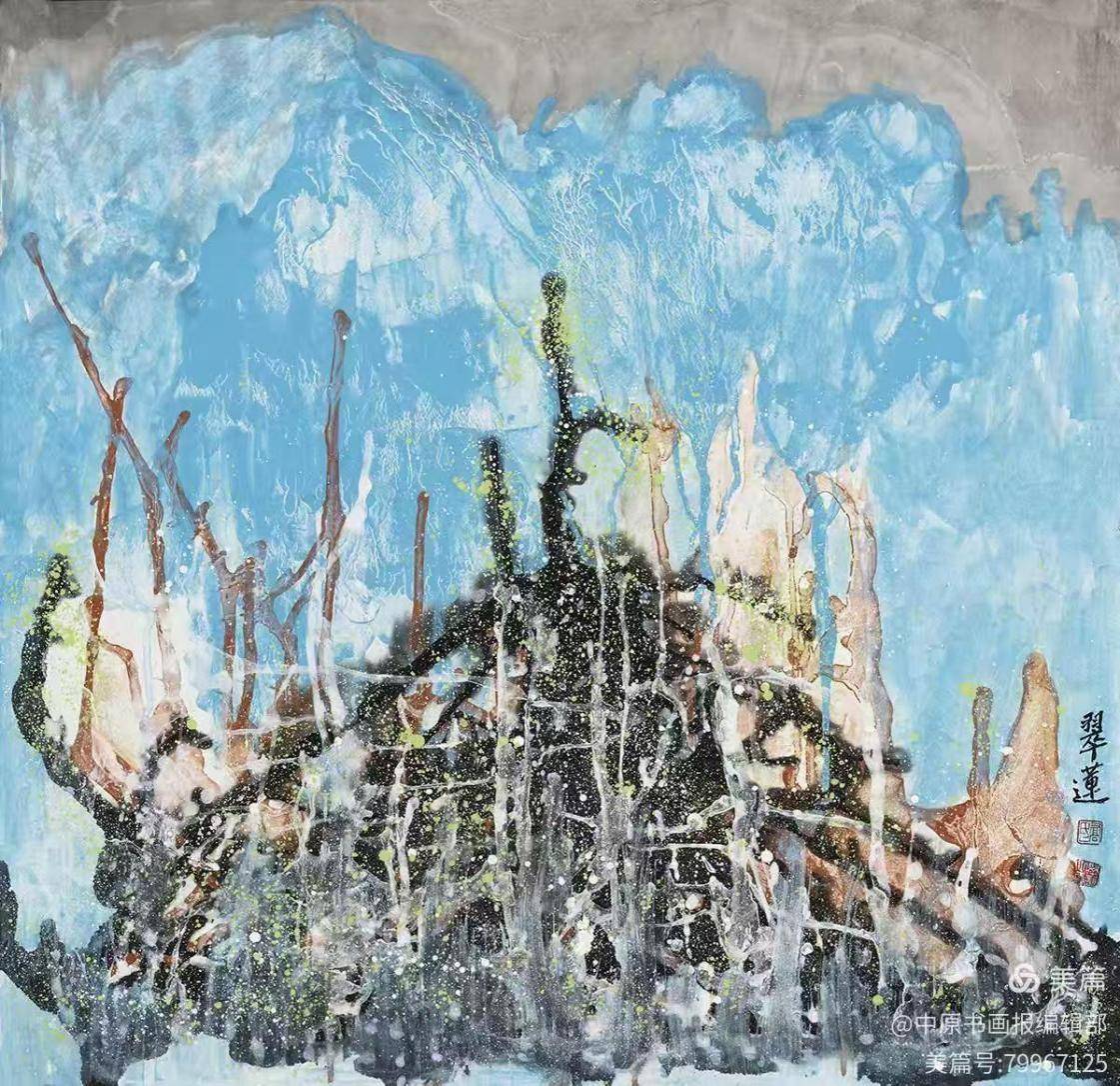 瀑喧山更幽68×68cm 抽象的图式。抽象绘画有者相似之处,但也有不同的视觉效果。波洛克的抽象绘画是颜色的自由滴洒而成。而乔翠莲的抽象绘画有着中国文化精神的写意性,自由书写的笔墨奔放是西画不可比拟的。在她的画面中,抽象的意象性跟中国画有着极为相似之处,从有法进入到无法的自由表达,也就是禅与道,她说随性而画,也不知道画什么,观众看到什么就是什么:色彩、线条、色块、笔触、性情。 乔翠莲绘画中的结构性、节奏性,整体性,光色变化、空间变化等是他感知客观自然进入主观感受的回归,在他不断的探索中从有形到无形游离,一切的材料与手法是他精神的延伸。 乔翠莲的新意象绘画,是中国传统艺术精神与西方现代审美情趣融为一体,具有东方文化精神的意蕴深远,变化自如,极富视觉韵律感,也是中西方绘画结合最为成功的画域高手。乔翠莲在中原艺术圈是一位非常具有特色的艺术家。常年以来,她开创了新意象的风格,也因此成为这一领域的领军人物。