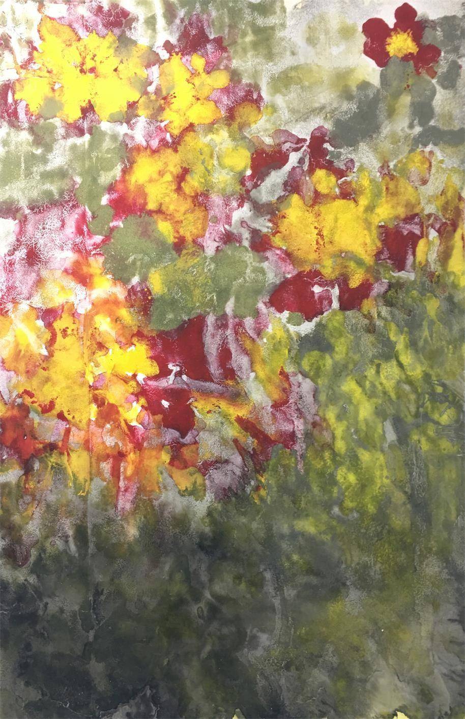清流68×68cm 乔翠莲在绘画上从写实到抽象再到新意象的转变,也是受到新时期全国各种流派的影响,如刘国松、周韶华、于志学、舒春光、丁绍光,她在绘画上的探索是用宣纸及牛皮纸的材料、技法和东方绘画的写意精神上的结合。 首先,丰富的色彩和肌理。乔翠莲在绘画上主要体现在丰富的色彩和厚重的肌理。画面红黄蓝的巧妙运用,红色的画面、蓝色的画面、黄色的画面、灰色的画面等都有微妙的色彩变化和色彩层次关系。反复肌理与重叠的色彩层次,无法辨认的图像是她反复创作的物象,冷暖与变幻的彩色,笔触有力,富有韵律感,给人梦幻般的艺术效果,画面的肌理厚重与微妙,层层叠叠的斑驳肌理产生丰富的视觉效果,使她的画面有着无限遐想的空间。线条也是乔翠莲绘画中很重要的元素。线条的自由溜出,婉转有力,刚柔相济,在画面不经意间体察到线条自由组与严谨的流动。