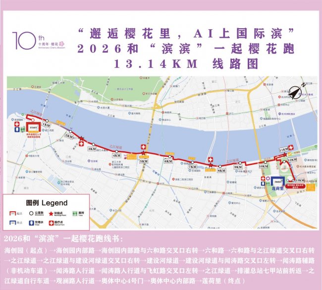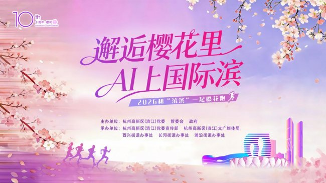跑步路线延续经典,从海创基地出发,沿六和路进入之江绿道,最终抵达奥体中心莲荷里。全程13.14公里,寓意“一生一世”。跑者穿行的,不仅是全球人才汇聚的“国际滨”,更是樱花烂漫的“生活里”。 活动在传承经典浪漫的基础上,深度融合“文化+科技”,以AI赋能打造十周年专属体验。赛道沿途将化身一座移动的“邂逅场”——“樱AI而聚”互动区引入大型体感竞速装置与AR沉浸式体验,跑者可在漫天樱花雨中感受科技奔跑的乐趣,还可与吉祥物“滨滨”进行AI语音趣味问答;漫步春日笺约樱花书市,体验阅读、非遗文化、手作艺术;在“樱缘信驿”声音邮局录制一张声音明信片,写下一封可寄往未来的“樱花慢信”;“拾光樱花隧道”中,历年精彩瞬间在光影间流转;“青樱乐站”里,青年乐队与快闪舞团燃动春日活力;“邂逅樱像”创意摄影区则为跑者定格专属的十周年纪念影像。科技与人文交织,运动与浪漫相融,每一步奔跑都与惊喜相遇。 值得关注的是,终点奥体中心将举办连续两天的“樱约奥体 潮玩未来”嘉年华活动。跑者和市民朋友们可一同体验花神巡樱、花Young游园、樱趣手作等创意活动,在樱花烂漫的春日里,享受运动之外的惬意时光,实现“跑完一场赛,玩转一座城”。