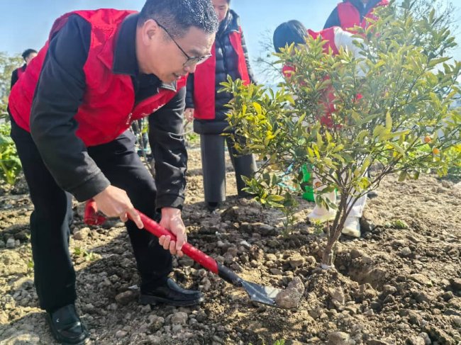 植绿田间助农,共筑生态乡村 在十八江村的田间,植树与助农活动开展得热火朝天。青年团员们分工明确、配合默契,迅速投入到植树工作中。他们挥舞着铁锹,铲土、扶苗、填坑、浇水,每一个环节都认真细致,干劲十足。经过一番努力,枇杷树和金桔树树苗在土地上“安家落户”,在微风中轻轻摇曳,仿佛在向大家诉说着对未来的憧憬。这些树苗不仅为乡村增添了一抹新绿,更承载着青年团员们对美好生态环境的向往和期待。
