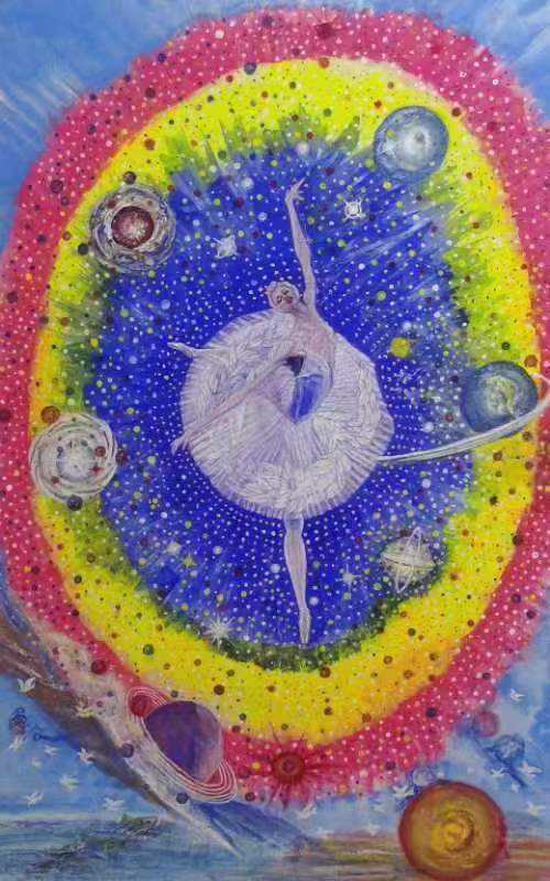 王凌寿先生国画作品《宇宙舞者》 宇宙舞者:王凌寿笔下的星际诗意 王凌寿这幅作品,以“宇宙舞者”为核心意象,将东方哲思与星际浪漫编织成震撼人心的视觉诗篇。 画面中心,一位白裙舞者舒展成最优雅的姿态,在星尘与光晕间翩然起舞,她是整幅画的灵魂——既是与星辰共舞的生命个体,也是宇宙韵律的具象化身。轻盈的笔触勾勒出裙摆如云的蓬松感,与深邃星空形成温柔碰撞,一抬手、一投足间,都在诉说着人类与苍穹的古老联结。 背景里,层层晕染的色彩如宇宙能量场般铺展:深邃的蓝底缀满细碎星点,似亿万光年外的璀璨星河;明黄与绯红的环形光晕,如同生命的年轮与宇宙的呼吸,温暖而磅礴。散落其间的星球形态各异,有的带着环形纹路,有的泛着温润光泽,它们围绕“宇宙舞者”流转,构建出既神秘又和谐的星际图景,让观者仿佛置身于浩瀚苍穹,感受时空流转与生命永恒。 整幅画既有东方水墨的写意空灵,又兼具现代艺术的奇幻想象,色彩浓烈却不张扬,笔触细腻而富有力量。王凌寿以画笔为舟,载着我们在宇宙与诗意间遨游,让每一个凝视它的人,都能触摸到“宇宙舞者”所承载的浪漫与哲思,读懂生命在天地间的自在与光芒。 |