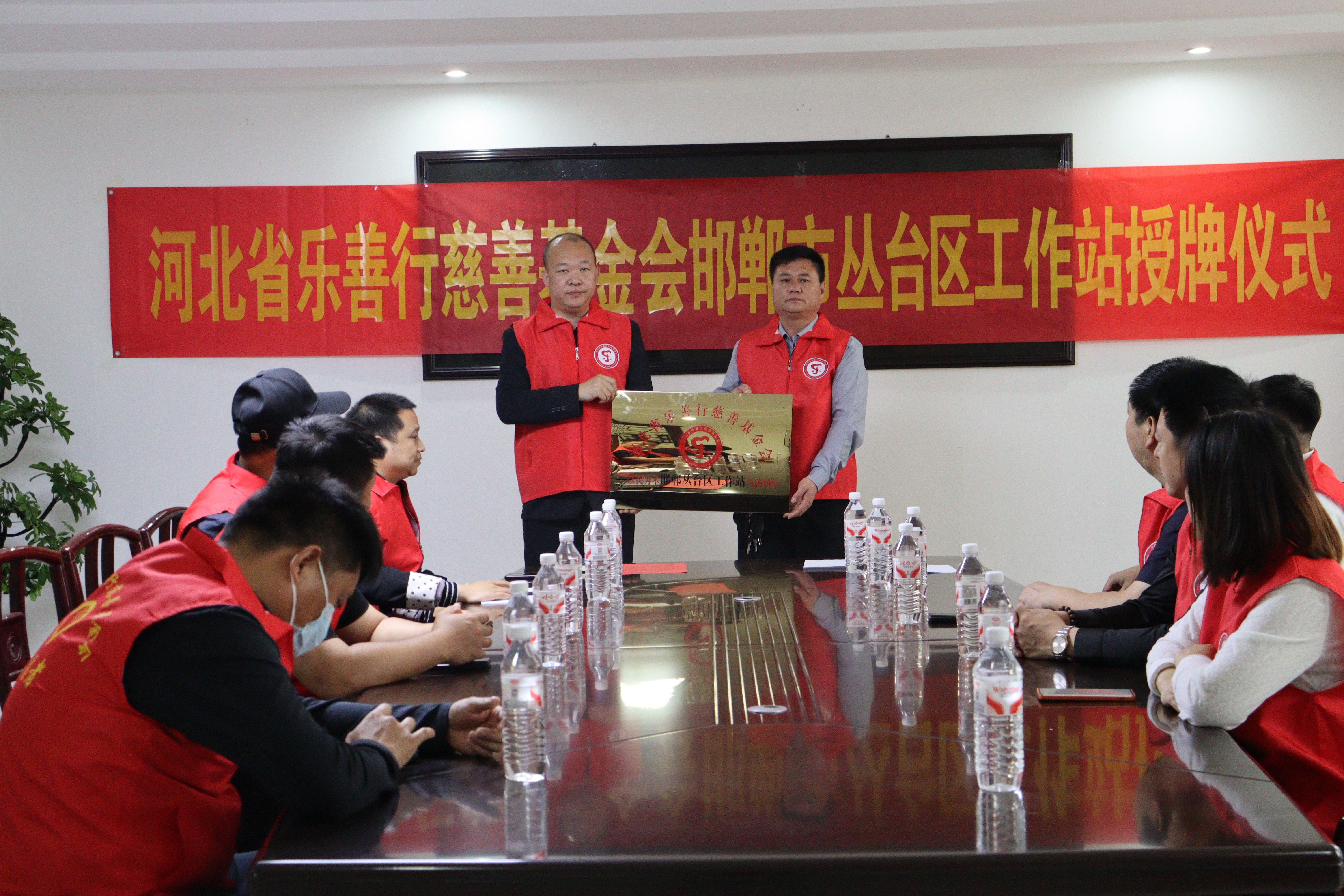 理事长左立飞向邯郸市丛台区工作站站长授予牌匾,工作站站长霍延涛郑重接牌。一块牌匾,承载着责任与期许,更是一份沉甸甸的承诺——未来,工作站将以牌匾为动力,扎根丛台、服务丛台,让慈善之花在邯郸这片大地绚烂绽放。