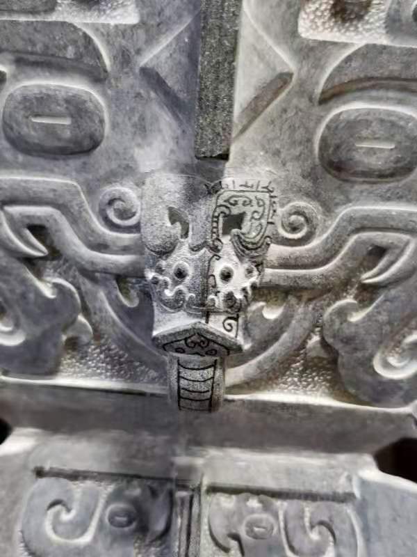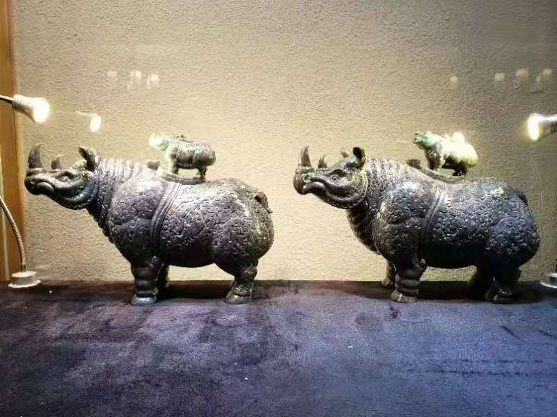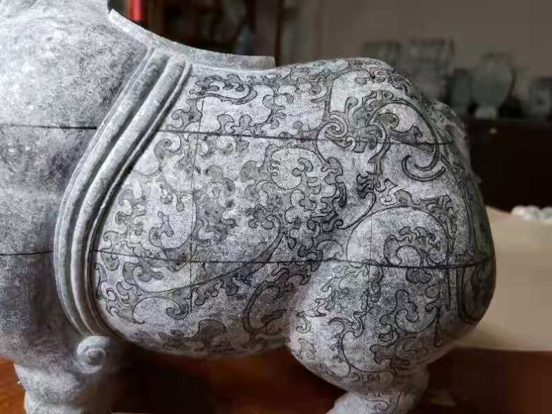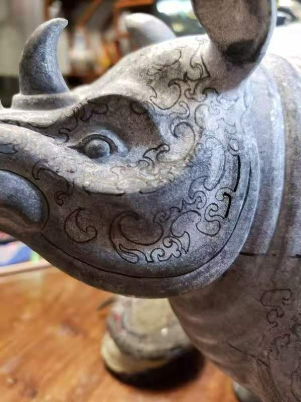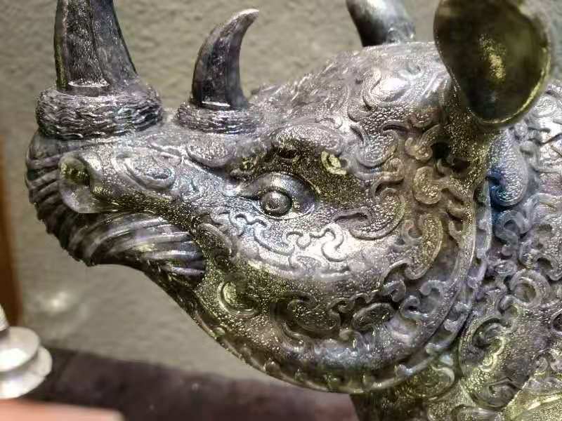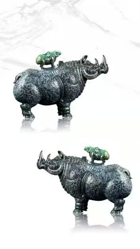 作品 (错金银云纹青铜犀尊)在2017年在当地玉石市场淘回来,原材料重210公斤,当时淘回来时已是一开为二,材料整体完美无大裂,油性十足为翡翠老钟黑乌鸡原料,材料顶部由绿色的表现,整体后庄度达到20公分 ,可雕刻成一对重器。从材料尺寸大小与色泽油度性 进行设计最终确定雕刻,中国国家博物馆收藏的(错金银云纹青铜犀尊),此尊体态雄健,肌肉发达,尖尖的双角竖立直向上,双眼专注地仰望着前方。与材料尺寸色泽相符,为最佳题材,绿色位置进行切割设计成犀尊顶盖位置,小犀牛站立在尊盖顶部一同仰望前方,两尊小犀牛俏色巧雕,单件作品尺寸39*25*18.此尊从 2017年底开始制作到2020年5月份,经过图纸的设计到大型打胚,尊身内部掏坛再经过尊身纹饰绘画细工线条错金部位以翡翠雕刻手法保留光面,内部点底的处理手法技巧进行雕刻,最后抛光错金部位抛亮光内部喷砂效果,底座制作而成。