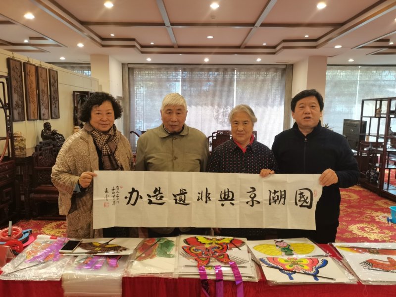 新华在线网特邀总编朱长云先生(右一)和料器非遗传承人邢兰香女士(右二)、风筝非遗传承人罗焕文先生(左二)、京绣非遗传承人李凤茹女士女士(左一)合影留念;朱总编书写第九届京作文化节活动主题“国潮京典非遗造办”书法作品!