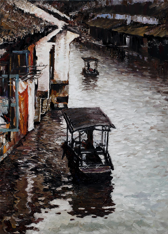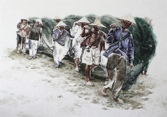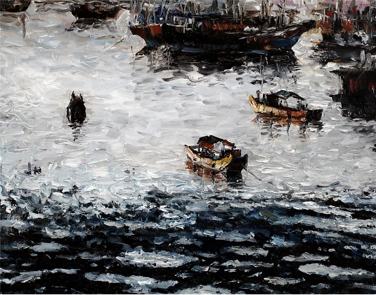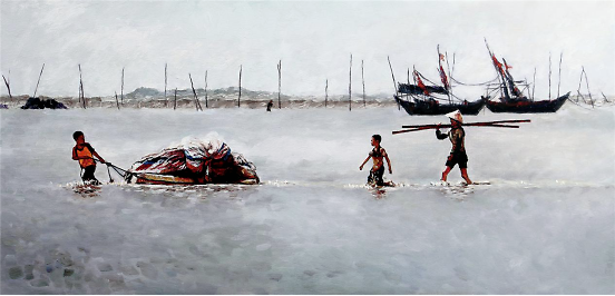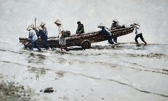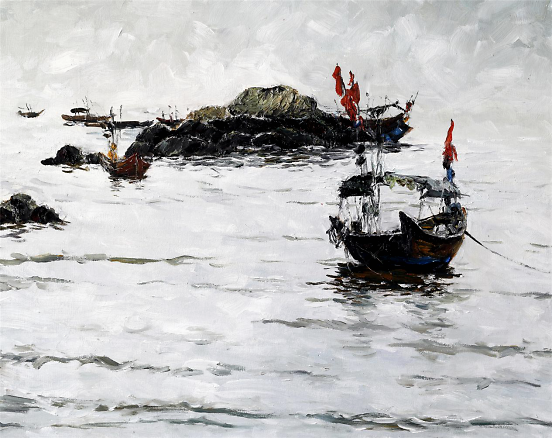 油画《风起北部湾系列》(一)170×120cm 是北部湾开海节近千艘渔船整装待发,拔锚再次扬帆起航的一个局部表现,系列组画展示渔港渔家赶海、开海的滨海文化,更是全方位宣传沿海沿边的旅游文化资源,推进西部陆海新通道建设,以及“一带一路”南向通道重要节点城市建设。 油画采用统一色调,画面海水简洁处理,渔民出海劳作形象活灵活现,动态自然栩栩如生,人物用反相手法描绘油光可鉴。在形式、创意、理念方面更有新意。