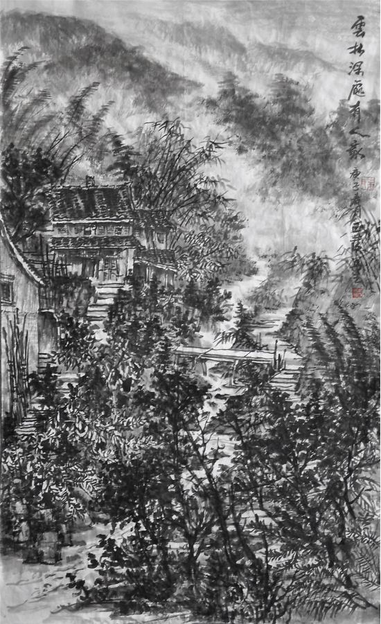 朱正发对于北方的山峦、岭南的林麓也时有揣摩。他深知山水画画的是画家的心灵,而非简单的客体,绘画的对象最终关照的是人性,而非自然。所以,重在画的本质,他正是以这样的心态广泛摄取不同派别的营养的,以为我用。作为沉潜于艺术中的画家,朱正发以古人的品性作为自己奋斗的目标。这些宋元先辈的敬业品质和笔墨精神成了鞭策他前进的动力,这些都可以从他的画面中找到线索。画家的大型作品构图直承五代北宋,以及元人遗规,有的山势婉转,石多正面峭立,撼人心魄;有的下笔雄强苍硬,轮廓线笔锋颖脱,细处墨法微妙;有的树木磊落,云烟变灭;有的看似纯水墨的表现,其实蕴含了丰富的构成意识和雄秀之味。