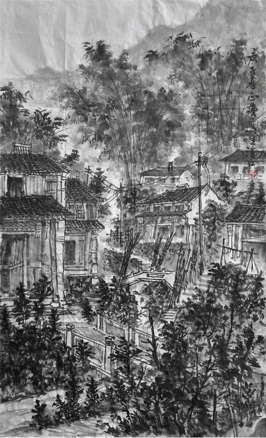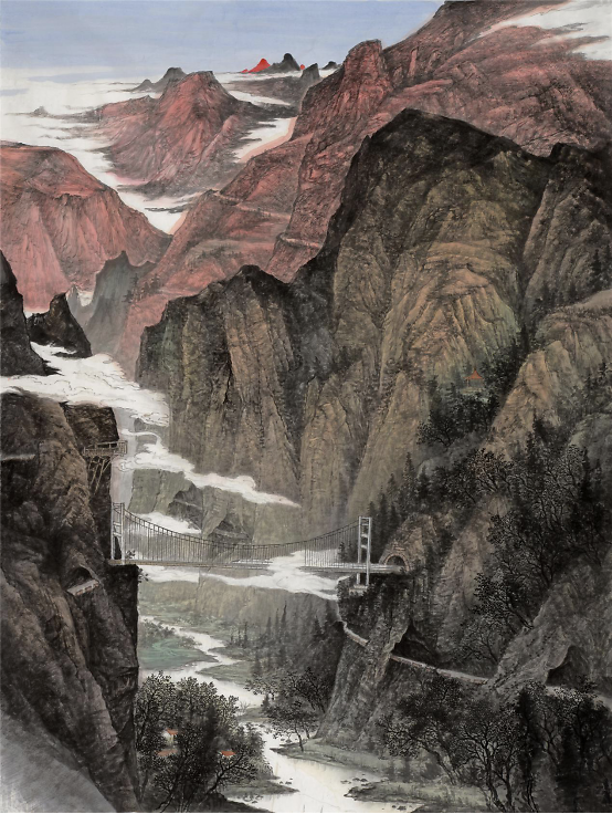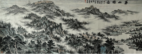 ——《句容胜景图》的精神追求 赵欣歌 当代提倡的和谐观来源于“天地与我并生,万物与我为一”,“天与人一也”的道家思想,这些中国传统思想就是把人作为自然的一部分,就是要求人要顺其自然,人不能独立于自然之外,其本身也是自然的一部分,做到可持续性发展。在绘画创作上达到“天地有大美而不言”、“天地之间有极致之美”,对自然山川采取欣赏的态度,认为自然山川是最无欲望、最恬淡的存在,是返归自然的理想场所。同时,包括天、地、人在内的宇宙自然都是有生命的、运动的,是充满生机与活力的,是互补共生的。和谐是中国人的审美追求,同时更是中国人的艺术境界。当代要建立和谐社会,挖掘艺术崇尚自然,以自然山川为描绘对象的精神,以情写景,以景寓情,情景交融,塑造新时代的现实主义山水新境界,以达到人与自然的和谐统一。这是中国艺术家的终极追求,也是中国画创作的最高境界。中国唐宋以后“儒道佛”思想的互渗,三教思想的交融同一和民族思想重新确立强化了中国人的宇宙意识和人伦社会的和谐立场。这种天人同构、和谐的认识是中国人对宇宙自然的深度思考,反映了一种可持续的动态发展理念。一个城市的发展是否有活力,是否能够既幸福了当代人,也为后人留下宝贵的后续发展潜能,是当下值得探索的。