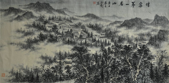 朱正发生活于道教圣地茅山,许多作品也多取材于此。《句容胜景图》构图博大,选择的视角也尽可能环视连绵的群山,以达到山势起伏和高低错落的美感;但在画面的局部,依然可见笔墨层次鲜活生动,富有节奏,真实再现了画家熟悉和热爱的家乡美景。为了创作这件作品,朱正发作了大量写生。这类作品以水墨造型为主,不以过多的色彩取胜,画面重点放在恬静真实之处,以达到一种宁静致远的效果。当然,这些即使不大的尺幅,画家也不忘传统格法和元人的胸襟,刻意经营,力求山川与我同化。由于写生做画多用水墨,这就要求画家能炼笔炼墨,以使笔墨灵活多变,达到淳厚中不乏滋润,含蓄而又自然。《句容胜景图》是画家投入精力一手回归传统;一手走向生活的结果。古语画品如人品,江南的山清水秀不仅凝结了画家的情感,也滋养了画家的胸怀,并且与画家一贯追求的画面精神和做事踏实的风格达到默契。所以,他笔下的山水温润可触,亲近可感,十分清新可人。这种传统的积淀不仅是笔墨浅层次的修养,而是传统文化和个人志趣的长期磨炼。这种修为具体表现为用笔的坦荡和块垒在心,也就是他作品古代文人的笔墨味道极浓。对于水墨浓淡的把握,以及积墨层次的深浅,他都以大量的实践来进行着艺术的幻化。 赵欣歌 中国艺术研究院副研究员