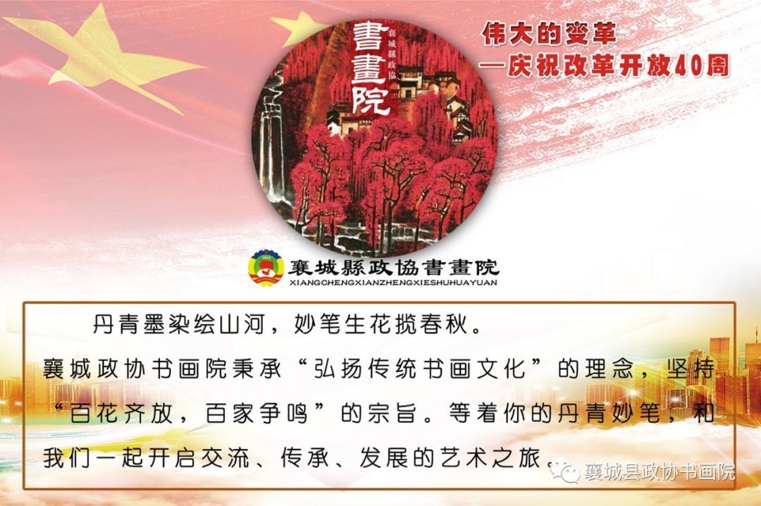 丹青敷彩歌盛世,翰墨流霞颂和谐。在2019年新年来临之际,由襄城县政协书画院主办的“丹青庆元旦,翰墨绘襄城暨纪念改革开放40周年”书画摄影网络展,今天与大家见面了。时逢和谐盛世,庆祝改革开放40周年,襄城县政协书画院全体人员及广大书画摄影爱好者,挥毫泼墨,奋笔疾书,丹青敷彩,妙笔生花。镜头定格展锦绣,翰墨怡情颂党恩。此次活动共征集书法、绘画、摄影作品165幅,入选98幅优秀作品参展。
