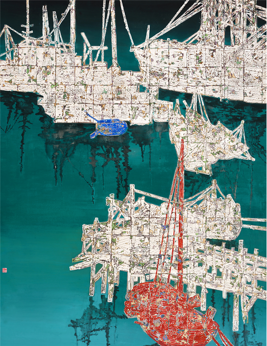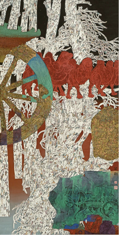 《丝路·丝路》。画面如诗如梦,现实生活中并不存在的赤红驼队,浩浩荡荡“漂浮”在沙漠胡杨前方,超越时空的平面设计给‘人以强烈的时空穿越感,而西部的神奇和古代丝绸之路的内涵,也通过汉唐飞檐、画像石刻、斑驳佛头、陆离陶罐、五彩车轮等元素符号,有力地烘托了出来。这幅作品,使用了新的重彩材料、技法,画面中金属箔的运用,很好的表现出历史厚重感,背景设色黑和红的渐变,令画面神秘感陡增,青、绿、白、金几大色块的对比冲撞,形成了巨大张力。观者可以从有限的二维绘画平面感受到历史纵横空间交错的多维空间。整幅画面以张扬恣肆的顽强生命姿态,诠释了丝绸之路的昔日辉煌,并蕴含继续见证新时代一带一路的新生机、新活力。