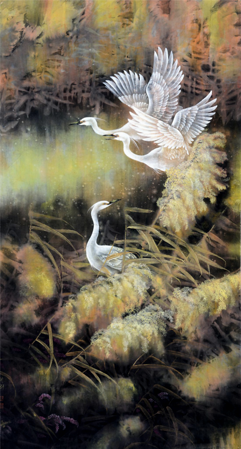 总之,画乡萧县的艺术水土,给了王开刚根须的伸延,外面世界,则给了他枝叶舒展、花朵绽放、果实初成的喜悦。其绘画语言更加丰富,对色彩追求、画面结构的处理,绘画题材的宽泛度,都在他的工笔重彩画作《生命如歌》(2006年入选中国美协主办的第六届工笔画大展)、《丝路·丝路》(2015年入选中国美术家协会主办的“吉祥草原·丹青鹿城”全国中国画作品展)、《岁月如歌》(2006年入选中国美协主办的“安徽·合肥工笔重彩作品邀请展”)、《生命的故事》(2015年入选中国美协重彩画会主办的“全国重彩画展”)和小写意花鸟画《花溪》《畅春》《鸣春图》上,得到了最好的体现:
