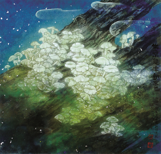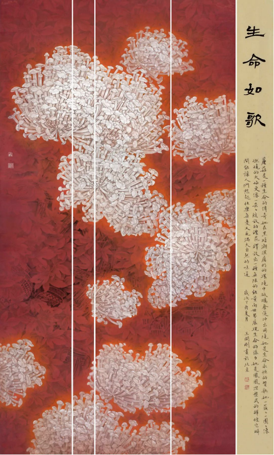 《生命之歌》。黑、白、红三色基调,线描精细,阐释了生命的蓬勃、枯木的重生、生命之花(白蘑菇)的绽放。大面积红和白的强烈对比,使画面色感碰撞强烈,让人直观地感受到生命不息的进取力量。白蘑菇在枯木上长出,冲破阴暗潮湿的地方迎接光明,一团团一簇簇,肆意跋扈野蛮生长,这种“化腐朽为神奇”,是生命之花白蘑菇的凤凰涅槃。整幅画大胆采用非对称构图,强调了自然哲学的气息,画面生机勃发,热烈奔放,极富视觉冲击力,表达出对于生命的敬意和赞美。