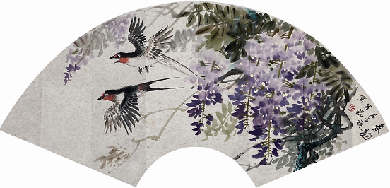 《花溪》。兼工带写画风,这类作品,最能代表王开刚绘画风格和画乡萧县龙城画派的渊源丝连。绿叶、紫穗,水墨渲染,虽不具象写实,但春意跃然纸上,满纸不见河流、江溪,但紫藤下翻飞的两只写意翠鸟,让观者明显感觉到了“春江水暖,花溪潺潺”。龙城画派大写意中的“重水墨、重生活、重神似”风貌,在他的这类作品中,得到了最佳体现。 一方水土养一方人,一方山水蕴一方情。王开刚的绘画事业渐入佳境,相信这位朴厚执着的皖北汉子,定会守住根,扩张胸怀,广纳八方水土之艺术精华,秉持中华传统绘画精神而又不拘泥于古人,融汇适合自己的诸种绘画技巧而又特立独行,实现自己“在大写意的土地上张扬浓墨重彩”的艺术梦想。(作者系中国作协会员,安徽省宿州市文化艺术中心副主任。)