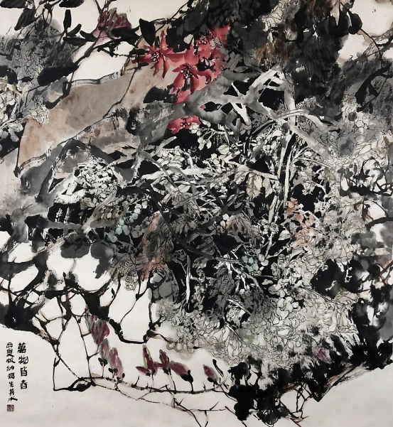 从形式上看,赵英水坚持在自然中体验与感受,对自然悉心观察与领悟,使他提取了某种经过心灵过滤的形式,这种形式的意味不在于那种挖空心思与矫情做作,而是以朴素、自然、本色为特点,以一种亲切、从容、率真的方式与当代人的审美心理、审美需求相契合、相呼应,甚至是同步;画家以当代人的眼光去观察自然,提取的形式自然是一种当代绘画的形式与当代人的审美形式。譬如,《春酣图》,便是在平面构图的总体框架下,置入笔墨、色彩与花鸟符号,并引入某种装饰性,使作品呈现出明确的平面化效果,而黑、白、灰的构成关系与平面分割使画面产生一种强烈张力,令人触目难忘,并领略到一种静悄悄的震撼。