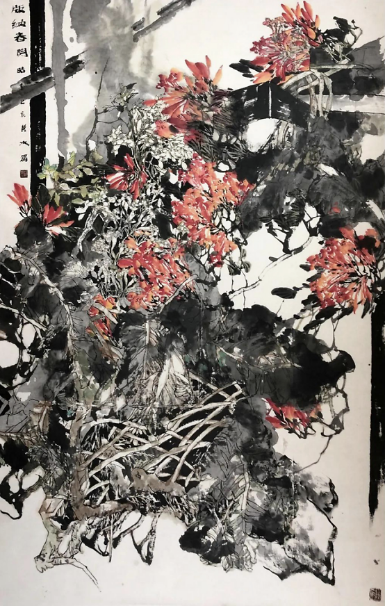 作为一名山东籍画家,更有责任以高雅的作品内涵展示山东人的品质。“花藤愁不乱,能乱即有神”。这里的“乱”不是无序更不是草率粗野,是按照中国传统绘画理论的“一笔两笔不嫌少,千笔万笔不嫌多”的法则去处理疏密空间关系而论。