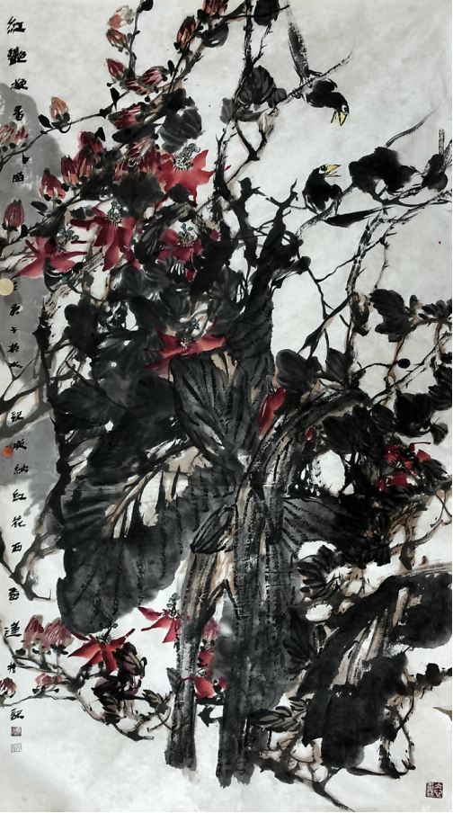 细看赵英水的作品,发现他在结构布局、笔墨构成、场景、视角的变化、环境氛围的烘托,感情、色调的渲染等,都有着别出心裁的处理;花与鸟等自然物象在他的作品中都被表现为“动态的形”并以与笔墨、图式处理相关联方式给以提炼与表现,更以其特有的生命运动节律去冲击审美主体的感官和心理,使他的花鸟画艺术在形式、语言、笔墨中都洋溢出全新的生活气息,体现出源于生活感受的活力。