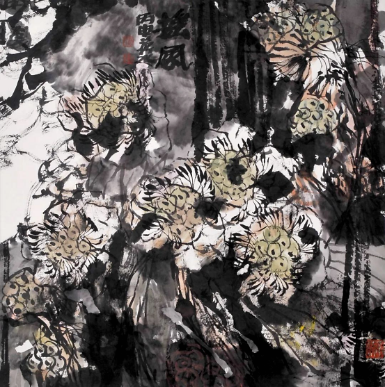 其次,是他作品里呈现出来的美丽而旺盛的生命力。比如说他擅长画的紫藤,藤条盘曲如龙舞,花开绚烂铺紫云;比如他画的菊花,不是娇弱和羞答答的,而是激情澎湃爆发式绽开的,灿烂,奔放,体现出雄、茂、璞、厚的大气之美。所谓“画虽一技,其中有道”,一笔一墨融会的是人的生命意识、个性品格和独立境界。