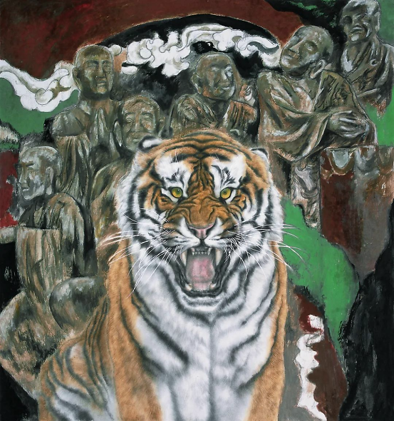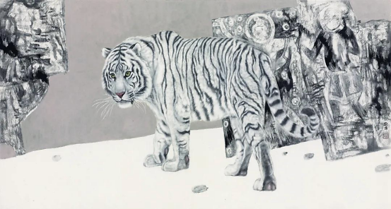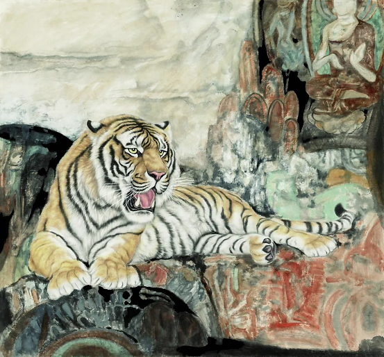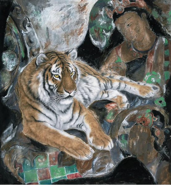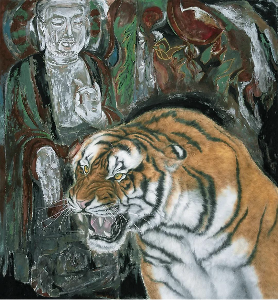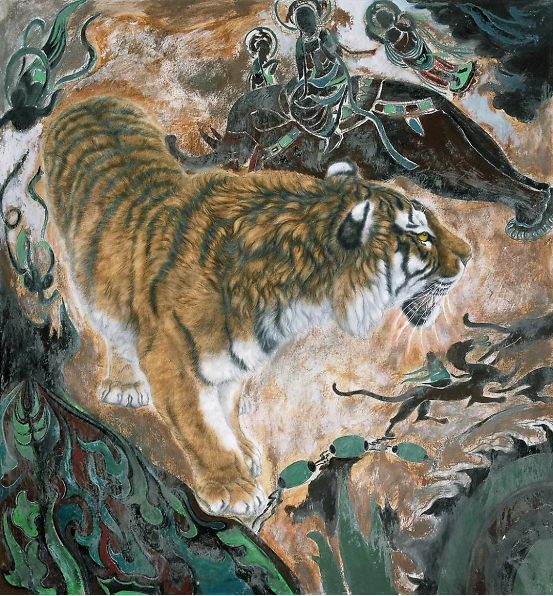 绘画语言虽出于手,实则根于心,艺术创作靠的是感情、靠的是思想,表现手法、形式的变化,不过是主观思想变化的结果。当年,当我有心想用作品表达“自性清明”、“安住无相”时,才有机缘将敦煌壁画和各种符号式的元素运用到虎画的创作中,《隔世箴言》、《往生》等敦煌系列和异度空间系列虎画作品才能应运而生。