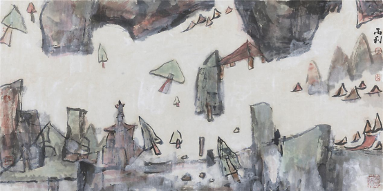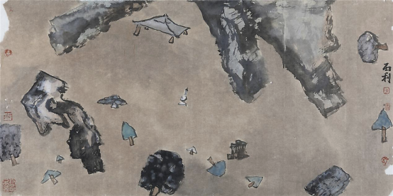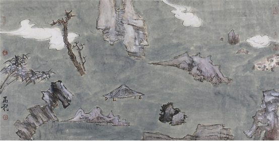 我溯源而上,试图以敦煌壁画来带动自己的想象力和创造力,提取传统山水画的符号,打破时空的束缚,以语言解构的方式将其分解重新组合,让传统山水画焕发出新的光彩,让人有更大的想象空间和不同的视觉体验。我尽量让语言符号简洁化,抽象化,仍以传统笔墨为基础书写表现,诗境的营造更加有趣味性,糅合风景画的一些元素,让画面具有一种新奇而又神秘的画面效果,增加其视觉效果。在作品中的符号选择上,主要把写生提炼的和历代大家经典的符号提出来作为主要构成元素,如空亭、松树、山峦、云霭、瀑水等。
