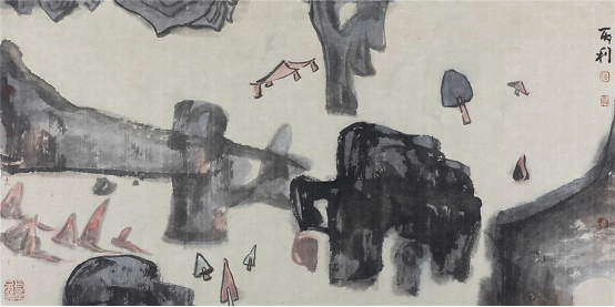 至于颜色,则尽可取法自然。雨后夕阳下,空中的淡冷灰和棕褐色的法国梧桐树梢的一抹暖灰色尽可收取画中。案头笔洗的青灰,红木笔筒包浆的深红,老家具上透出的灰褐,羊毛毡上的灰白,芦苇帘子透光的淡米黄……都可取法。山水画要画得有味道,就要画出艺术家活在当下的内心感受。西湖的雨、中山陵的秋、潇湘的景、苦咖啡的味、鸭蛋壳的色……能够刺激我的感官让我艺术觉醒的林林总总都会和我的作品产生化学反应,能够促进我的山水作品成熟起来并且绽放光彩。这才是真正意义上的艺术和生活的关系。