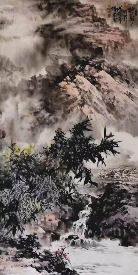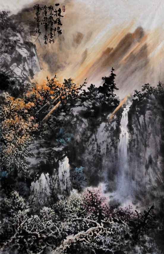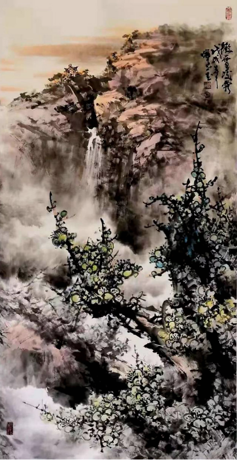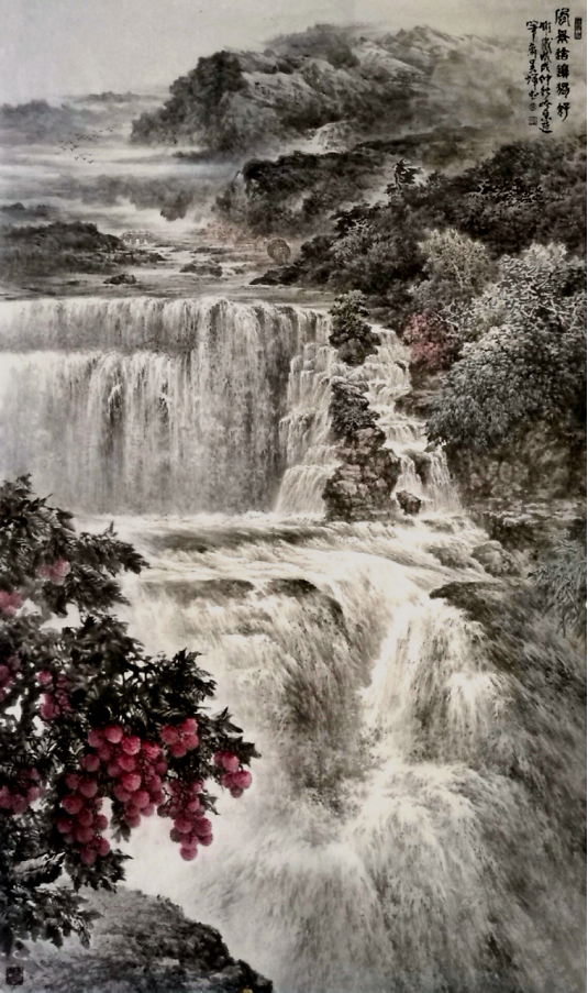 远处望去,峡谷嶙峋多姿、鬼斧神工,山峦满目苍翠、万木葱茏。瀑布群好似镶嵌在这深山峡谷中,一级接一级如银河倒泻,耳边仿佛可以听见水流击打石壁的声音在山谷回响。近处一株荔枝树上硕果累累,色与墨的交融,使画出的岭南佳果鲜嫩欲滴,令人垂涎三尺……整幅画作色彩、造型、构图浑然一体,大气磅礴又见微知著,充满朝气与希望。