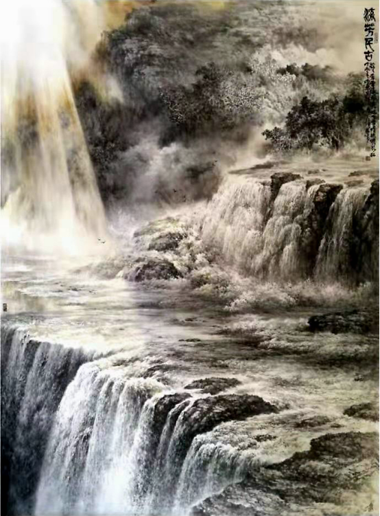 翻看吴辉忠的朋友圈可以看到,在齐白石纪念馆第1展厅正门展出作品的画家从左到右分别是:姚鸣京、谢志高、张道兴、徐里、董竟成。视线内,右手边通道靠近的作品就是吴辉忠的《流芳千古》。这幅247cm×184cm的作品以阳光、水雾、瀑布、奔流以及山石树木组成画面的主要表现元素,观之如闻奔雷般的水声响起,奔涌冲击、气势磅礴。从表象看描绘的是山川河流,内在精神却似意寓历史的长河奔流不息,蕴含多少壮怀激烈的记忆沉淀其中,流芳永远。