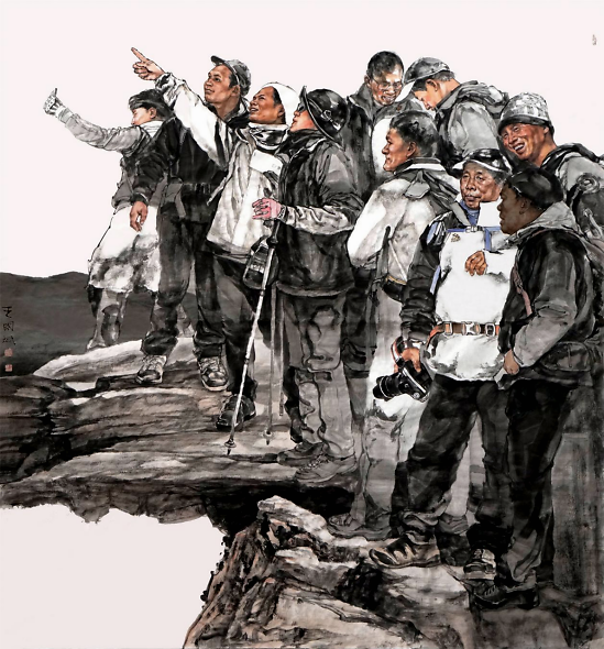 《助力冬奥》186×186cm 2018年 这几年王国斌跟背包客较上了劲,画了一系列背包客远足的作品。引起广泛关注,也让我改变了曾经对他的印象。背包客也称驴友,是一种自助的旅行方式,花最少的钱,看最多的风景。大漠孤烟,荒郊野岭。要机智处理随时遇到的状况:突然的天气变化。这正是他所欠缺的。