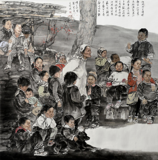《我为冬奥加把油》220×240cm 执着的背包客——王国斌 王国斌是一个有爱心的人,一个守规矩的人。做事认认真真,踏踏实实,兢兢业业,非常执着甚至有点执拗,”劳模”式的人物。 本科毕业后他申请到京郊支教,成为一名乡村教师,所以他的作品多表现身边的学生及贫困地区的留守儿童,他的的作品充满着对孩子们的关爱,充满着正能量。因此获得了很多的成绩和荣誉。但就作品本身来讲,总觉得还是有人的影子,缺少个性,缺少点趣味,缺少那么点灵动之气和创造力, 一个画家通过学习他人延伸自己是一种捷径,但因此把自己遮蔽在他人的影子里则是一种不幸,说惨点就是一个还不错的模仿秀,这就是我过去对王国斌的整体印象。