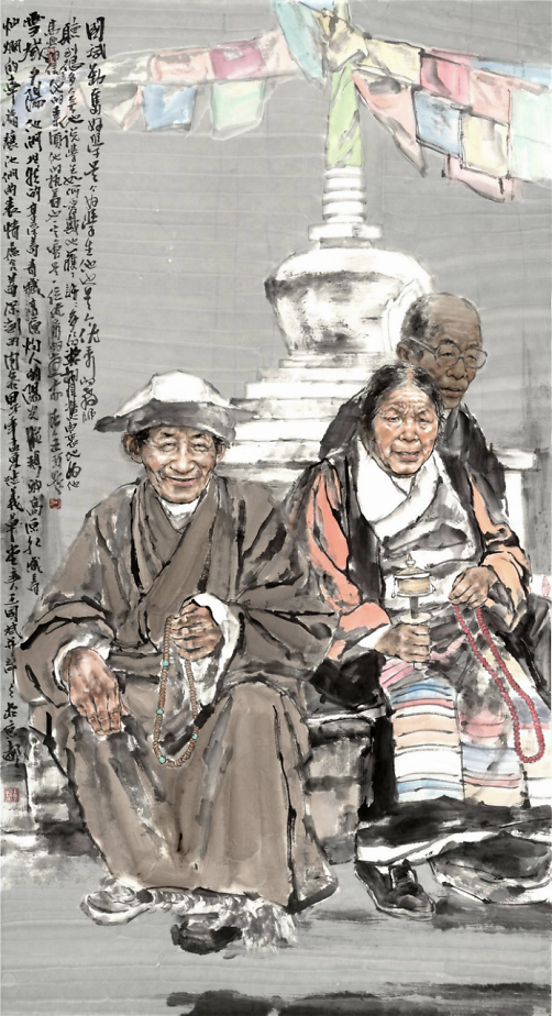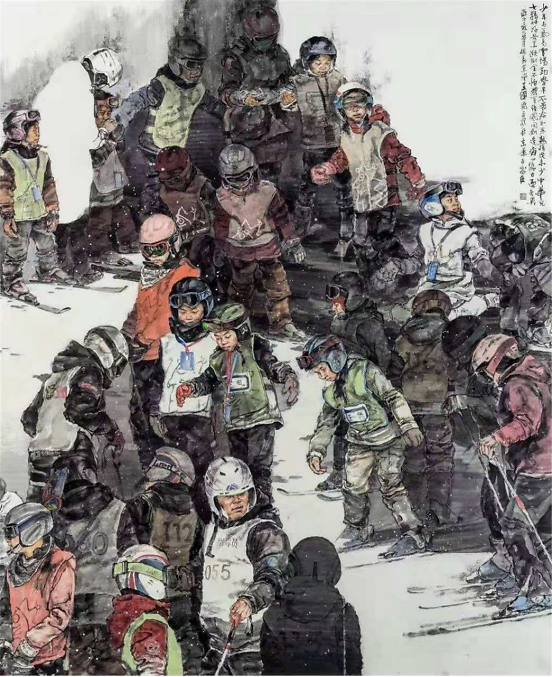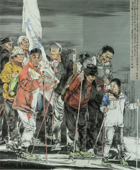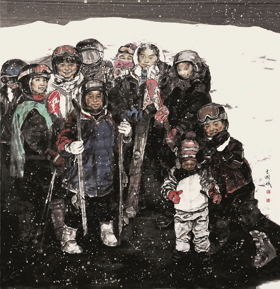《助力冬奥——百姓》200×240cm 2019年 王国斌出生在山东潍坊安丘,一个普通的知识分子家庭,虽算不上富裕,但家人给予了百般疼爱, 养成了王国斌乖顺的性格,中学、 大学到攻读硕士学位,一路顺风顺水。他清醒的知道这一点,因此,一有闲暇便背上行囊,徒步荒郊,翻越了一道道岭,也跨越了一道道坎,以磨砺自己的意志,修补从前的不足。其实从当年的京郊支教到今天的表现背包客无一不是王国斌一种理择的磨砺,这正是王国斌的聪所在,如今他一步步走来,从容而淡定,没有错过任何的风景。资之深,则取之左右逢其源。积累深厚的功夫到家后,就可以得心应手左右逢源。王国斌的画还是那么的充满着爱,充满着正能量,单纯中添了一些厚重,秀美中多了几份儒雅。 一个有教养的人最基本的特质是:文质彬彬,温文尔雅心平气和而有悦色,这些词简直就是给王国斌量身定做的,他的画亦如其人。 2017年1月 王珂于望京 (作者系全国政协委员、首都师范大学美术学院副院长、博士生导师)