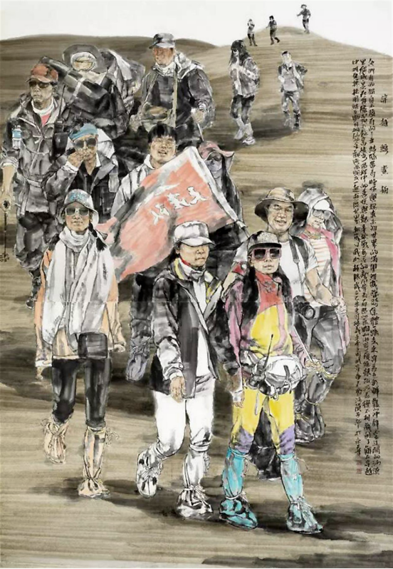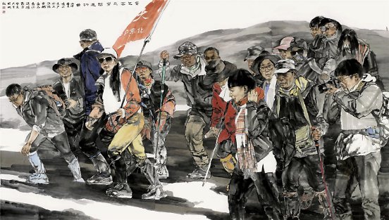 《穿越素描》210×160cm 国斌凭借着扎实的造型能力,塑造了一组组群像。这些形象有着雕塑的力量和宗教的神圣感,让我不禁想起贝诺佐·戈佐利在佛罗伦萨美第奇宫画的《三博士朝拜》。国斌笔下的人物穿行在山峦河流之间,但却不是《早春图》中的豆人寸马。高山大川不是绘画的直接对象,但却存在于画中背包客快乐兴奋的目光里,在他们抬手指点的远方。这些以中国传统工具和材料绘制的图像,因此建立了人物与山水之间一种新的关系:不是文人画所强调的精神之旅(卧游),而是现代人的身体力行。