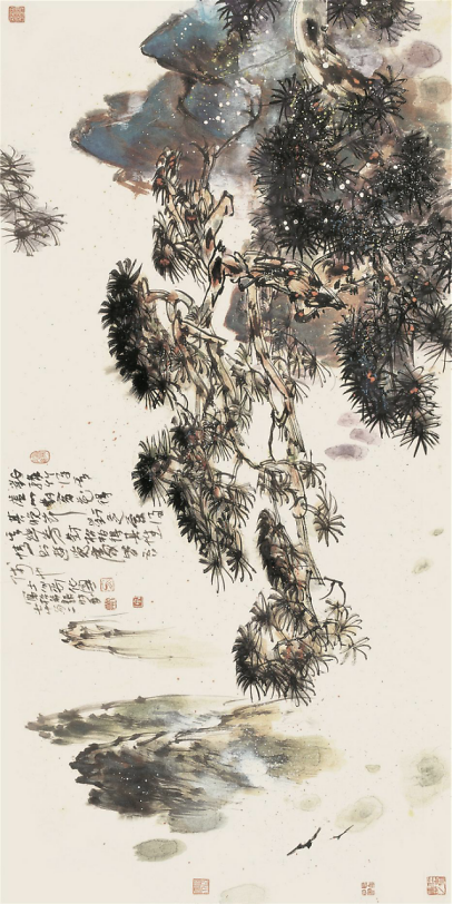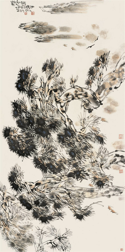 中国绘画有谢赫的“六法”千年箴言式的保驾引航,才终于没有像西方绘画那样,花样不断翻新,导致自乱阵脚,自拆殿堂,这是中国画和画家之大幸,坚守使它成为世界艺术中的独秀孤峰。“从心所欲,不逾矩”,有规则的自由发挥,彰显出中国画的沉稳飘逸,化兴君之苍松系列多变而又成法入理。 如今他笔下之松,既脱去西画自然写生之表相,又得益于西画写生之实功;既少见前人笔下画松之旧容,又得益于传统笔墨之神功,二者使他培育出属于他的系列新松,他突破了传统对松树认知的有限性,拓展了松树审美无限语境,并且实现了他从西画到中国画的华丽转身。