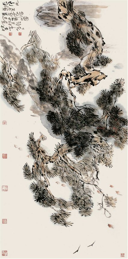 在化兴的画中可以感受到他和传统意念的共鸣,同时也有对传统归属的冲击,他的挣扎和努力,他以苍松为载体,努力去发现自我、表现自我,除了苍松的崇高精神气质:苍劲有力、坚忍不拔、傲风寒、挺福寿之外,他的松开始显示多姿多彩,甚至寓有人性的东西,最终在他的苍松世界中,出现了种族的繁荣景象。
