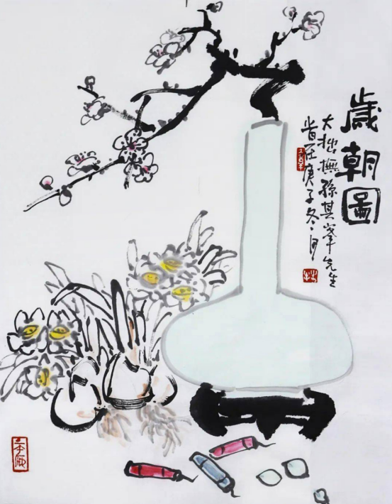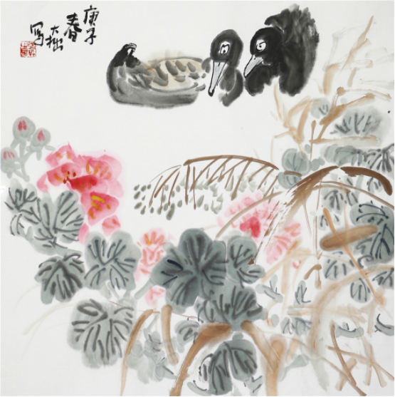 大拙喜欢花鸟画,早期画画受新文人画影响,临摹了很多新文人画作品,我和大拙初识时,去他家里,第一眼见到新文人画代表画家作品挂在墙上,很吃惊大拙有他的作品,当我认真的欣赏后,大拙笑嘻嘻地说是他临摹,以假乱真,让我想起当年的张大千,也是临摹高手。大拙以自娱自乐自我安慰方式画他想的画,很少展示出来。从我第一次见到他的画开始,中间有很长时间没有见过他的画。