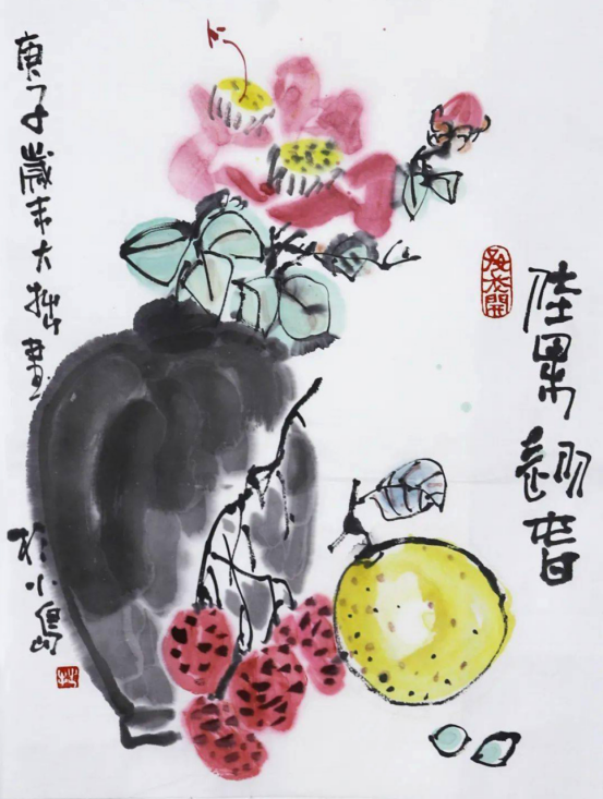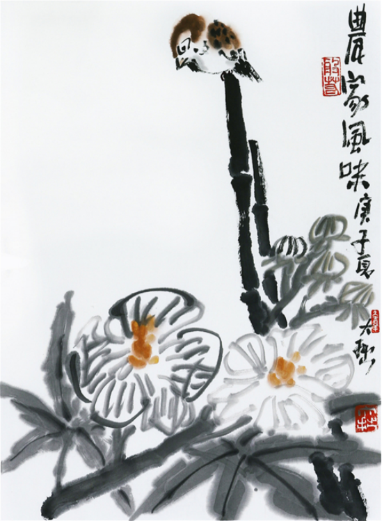 早在南北朝时期,美术理论家谢赫就提出绘画理论中的“六法”论,所谓:气韵生动、骨法用笔、应物象形、随类赋彩、经营位置、传移摹写。这六点在当今中国画创作中仍被奉为圭臬,其中“气韵生动”被放在第一位,后五项都是为它服务的。这是因为在中国人的审美中,生命感最被人们所崇尚。对生命的崇拜和热爱让我们喜爱一个“活”字,这在花鸟画中体现得尤为显著。花花草草、鸟兽虫鱼都成为人们对于生命的盼顾与关照。所以在中国花鸟画当中往往把形象的真实性放在其次,而强调夸张描绘对象的情态,使得它们更加生动传神,整个画面气韵流畅。画面的每一处笔墨都体现出生命感,又要在整个画面环境中和谐相处。这一点是深具哲学意义的,也是中国文化的精粹所在。在大拙的画中,我们看到了这种生动与和谐。看似很随意的几笔,往往能展现出花卉鱼鸟的精神品格。他画的鸟和鱼有的憨拙,有的倔强,有的懒散,有的困顿,但气息都不俗,又都和整个画面融为一体,配合稚拙潇洒的题字,更是相得益彰。