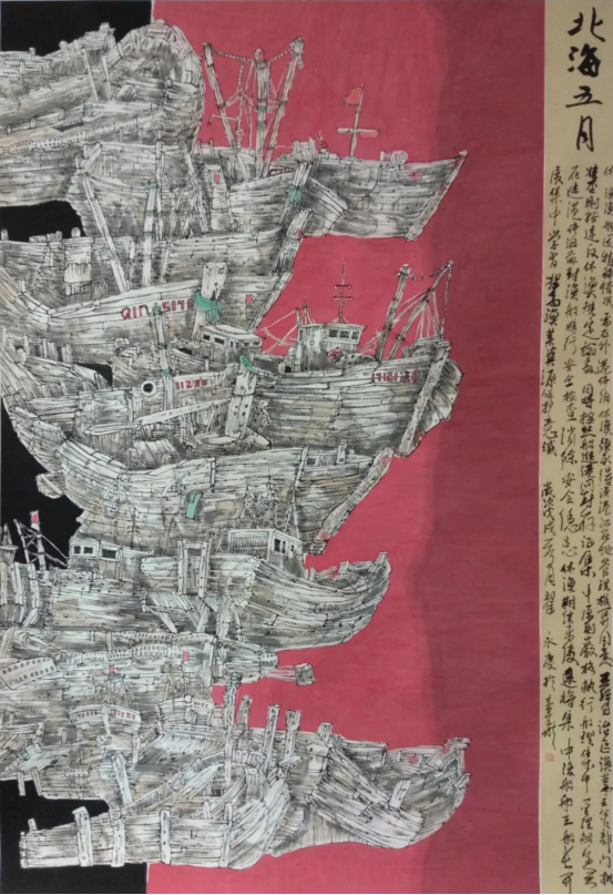 于是,翟永庆背上行囊、不计寒暑,踏遍了秦皇岛的山山水水,开始了以朴素艺术语言描绘真山真水的苦旅。由于他对北方山水熟悉和喜爱,在写生过程中,逐渐感觉到原来学习的以南派山水为主的技法总是不能准确的表现北方山水那种博大、雄浑、厚重、质朴的形象。在反复探索后,大胆地尝试试用焦墨画太行、燕山……