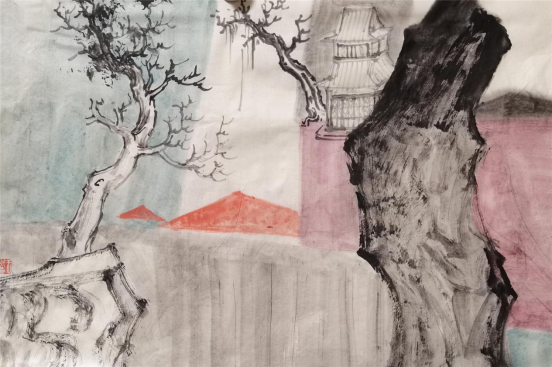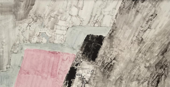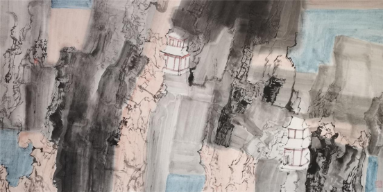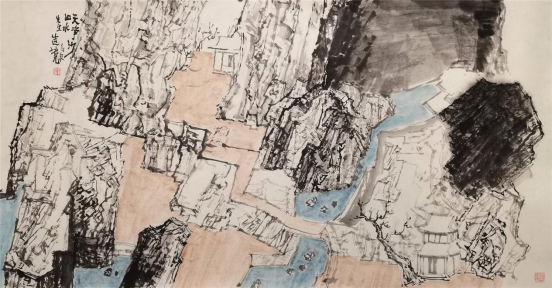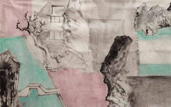 少川的山水画呈现出两种不同的面貌。一种是以简单的树、石、房屋作为画面要素进行组合,画面单纯、朴素,以如何处理物象之间的关系来构思有意义的画面。另一种风格相对复杂,虽然画面要素仍是简单的树、石、房屋,但是在构图上打破了时空及物象之间的正常秩序,物象之间相互穿插、相互生发,给人以荒诞、离奇的错觉。这类作品如“山川相繆”“山河任我重安排”系列,其创作灵感源于中国古代佛寺壁画及西方现代派艺术。无论哪种风格,与传统山水画的构图形式都有明显的不同。传统山水画构图强调山有龙脉,水有源流,路有来处,要做到可居可游。南朝画家宗炳把山水画的功能归为“老病俱至,名山恐难遍游,惟当澄怀观道,卧以游之”。一千多年以来“可居可游,澄怀观道”成为山水画的重要功用和审美法则。少川的山水画,摆脱了这种功用目的,将山水画还原为纯粹的审美形式,从而摆脱了传统山水画构图的束缚,形成了具有现代审美趣味的山水画作品。