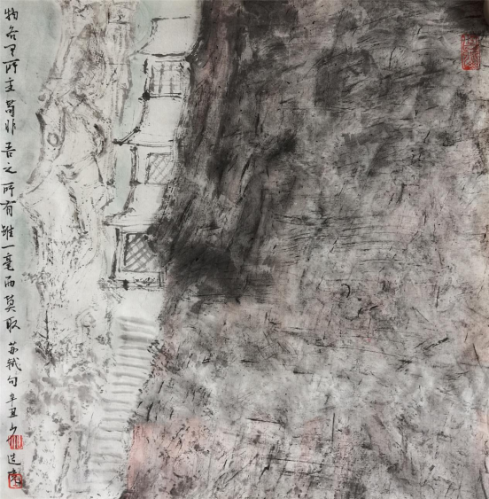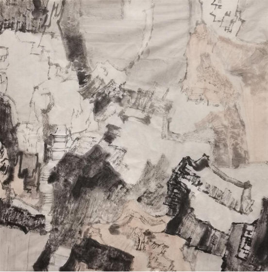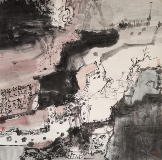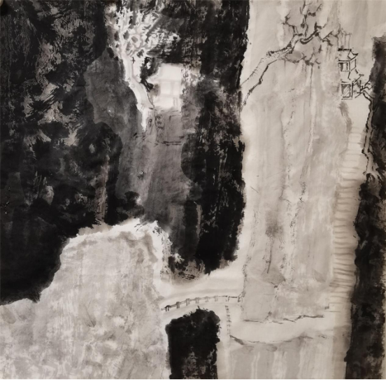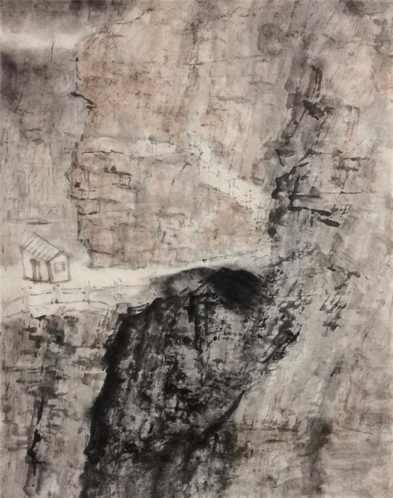 “山水”在中国文化中不仅仅是一种客观的自然物象,在某种程度上,它还被赋予了一种具有哲学范畴的“自然”的意义。山水画作为中国传统绘画最经典的科目,它的传承与流变最有序、最有迹可循。在山水画发展的过程中,它自身演绎着一种具有内在逻辑的传承与变化的规律:每个时代之间有着内在的传承与递嬗;而在形式风格上,又有着明显的时代特征。从这个层面上说,研习山水画,必须对经典作品进行全方位的研究——既包括对作品外在形式的临摹学习,也要从作品的情感、立意来揣摩画面的一笔一墨是如何体现、表达作者的情感的。少川二十多年学习、研究山水画的过程,无疑是沿着这样的路子深入前行的。作为少川的老师,我对少川的作品比较熟悉。我们从他“意与古会”“江山怀古”等系列作品中可以看出他对于传统研究的深入程度。比如,他对于山水画理法、程式的把握,还有他对于以笔墨表现物象的深刻理解。“笔墨”在中国画中同样是一个超越了客观物象而具备精神旨归的作品的核心价值要素,具有独立的文化品格和审美价值,既体现物象更表达情感。很显然,少川在把握笔墨表现物象与意象这个度的过程中,更倾向于意象的表达。另外,少川在画面笔墨的经营中,放弃了传统绘画的温润、和谐表达,而是将笔墨的浓、淡、干、湿要素作概括处理,使画面呈现出一种强烈对比的视觉效果。他把这作为自己的一个艺术追求和试图对传统的超越,同时,这也反映了现代社会的一种审美需求。