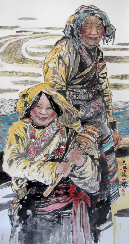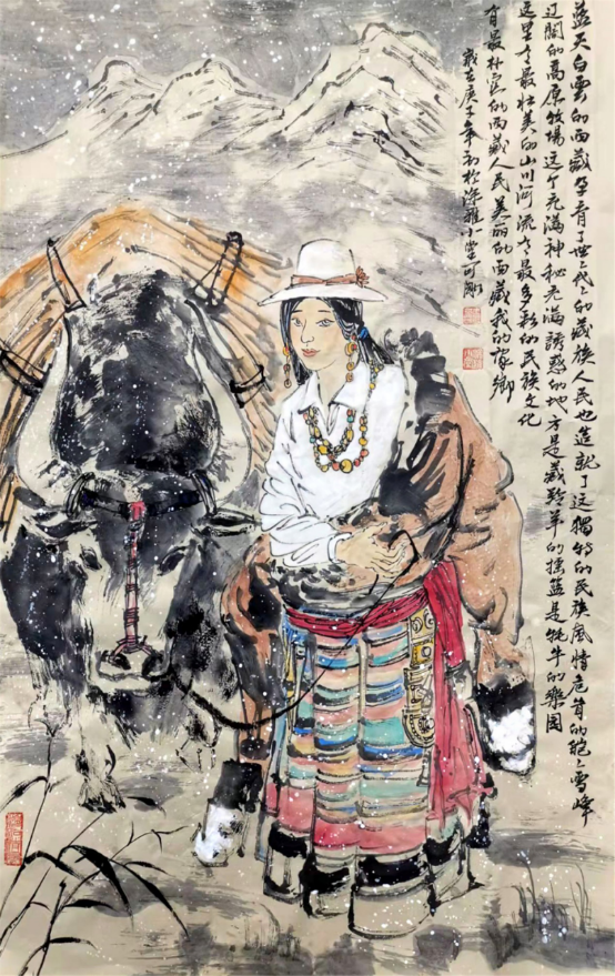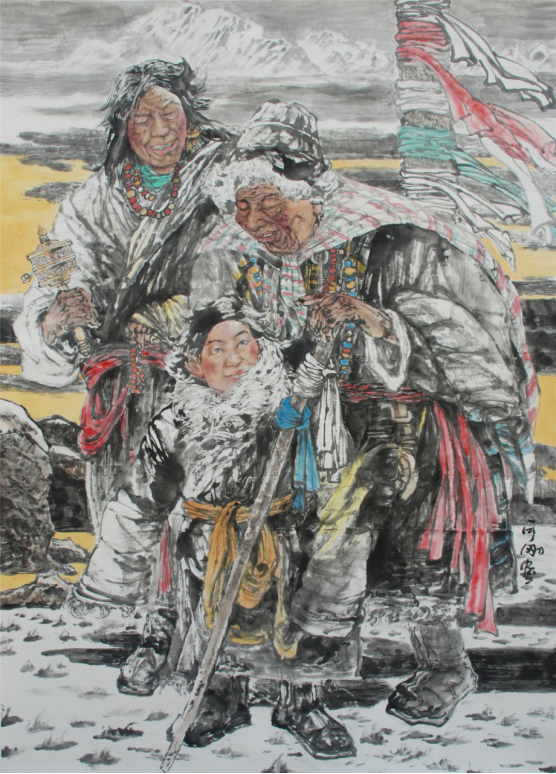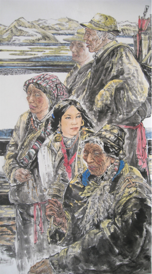 生活的际遇, 是无上的善缘。 在时光的流逝和日月的积累中, 让我历练着寻找心灵的家园。 西藏的岁月, 是我生命中最宝贵的一段。 命中注定, 在生命的轮回中经过寻梦的高原。 这是这首诗作的开章明义,有着很令人感动的质朴和睿智。他在诗中谈到了西藏的蓝天和雪山,谈到在这里创作的画作是拉萨岁月的痕迹,是心灵深处意义的求探。在深入了解民族文化的过程中,在那一张张沧桑表象的背后,可刚看到了那里的人们本性里的佛性和古典……这些切身的体验和感悟,使他的画作充满了一种印证人的灵魂生存的内涵和注重每个人的本性与生命的尊严的人文主义倾向。这些画作有许多都留在了西藏,特别是他在西藏举办个展时的那些精品之作。