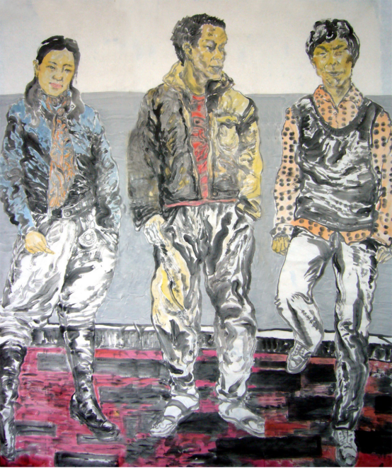 可刚的现代水墨作品我有幸见到了数幅,如《36面相图》、《夏日系列》、《三个人》、《相互关系》系列、《人体》等。这些画作都是以抽象水墨、观念水墨的理念为基础的创作实践,艺术的重要功能已经由审美特性转向了鲜明强烈的社会针对性。比如在《三个人》中,三位主题人物(二男一女)着现代服饰卓然而立,将当代青年的豪放感和不羁性昭然推出,然而,三个人的个体灵魂却分明呈分离状态,一眼可见猜忖、傲慢、不合作等现代都市人际通病;比如《相互关系》系列中的《月光、灯光、漠视》,三组画面合而为一,组成了一个夜色下人与人之间的关系图例,有漠然擦肩而过者,有巧舌如簧当街鼓噪者,有漫天要价的小商品兜售者,夜色中,有蝇营狗苟的不见天日,有微光下的欲盖弥彰,有人际通道的无形障碍和羁绊,不一而足,这种对世事的直面,对现实的批伐,将“水墨实验”的真谛宣言式地一泄而出,并且水墨的运用也以濡墨为主,增加了“以水墨加当代的方式,延缓水墨画的生命”的诠解尝试。用可刚自己的话说,这是“有的倾向于水墨表现的‘象征性’,也有的倾向于‘表现性’或‘观念性’或‘精神性’”。