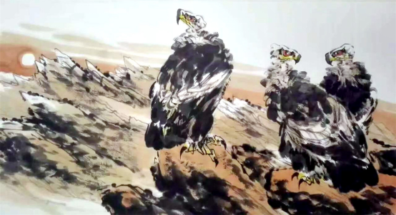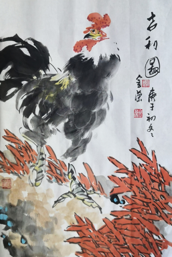 雄鹰是他喜欢的绘画题材之一,或雄踞松石,或翱翔长空。对于鹰这种动物的描绘,他笔锋犀利,纵情挥洒,整幅作品充满了刚劲的气势,在画面中用更加刚毅的线条来突出鹰的雄姿和霸气,让我们能够直观的感受雄鹰的凌烈姿态,在他的笔下,以公鸡作为主角的作品则显得充满了生活的情趣,画面柔和了许多,也更加丰富,将国画中色墨相融的技巧发挥到淋漓尽致。欣赏张金荣的国画作品,完全就是一种美的享受,是对于国画艺术的又一次膜拜。