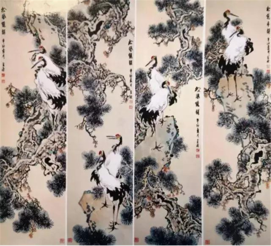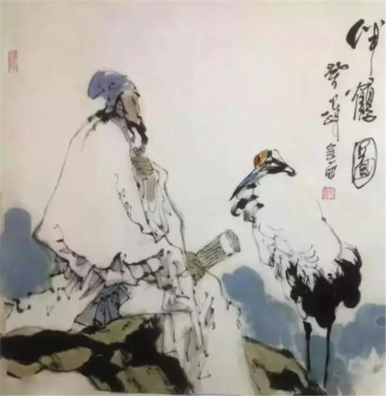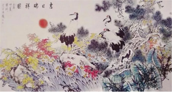 两只仙鹤栖息在松树的主干上,勾画出了人们喜闻乐见的通俗题材-健康长寿,松鹤延年。在造型刻画上,仙鹤神情安定,胜似闲庭信步,给人一种与世无争,泰然处之,安居乐业,幸福美满的感觉。最值得一提的是整个画面线条老辣而又苍润,不出干笔,多以湿笔运行,所以感觉流畅、滋润,有韵律在舞动,你的心情也会随之荡漾。张金荣的国画,可以说是纯文人画。有着丰富的文化内涵,古朴、典雅、厚重、沧桑,饱含丰富的中国古典哲学。