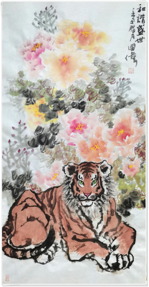 虎年画虎 山君迎新 胡国伟 老虎在中国传统文化中寓意着威严与勇敢。历朝历代,军中骁楚,常被冠以“虎贲”二字,而调兵遣将的令牌则被称为“虎符”。 我的家乡豫东平原没有老虎,更没有遭遇过虎患,所以老虎在百姓心目中的形象一直是正面的,能够驱鬼辟邪的。每逢春节,大多数人家都会购幅老虎的年画贴在堂屋图个吉利。妈妈们也都喜欢用各色布料缝制虎头帽、虎头鞋给娃娃穿戴,希望宝宝像小老虎一样茁壮健康成长。